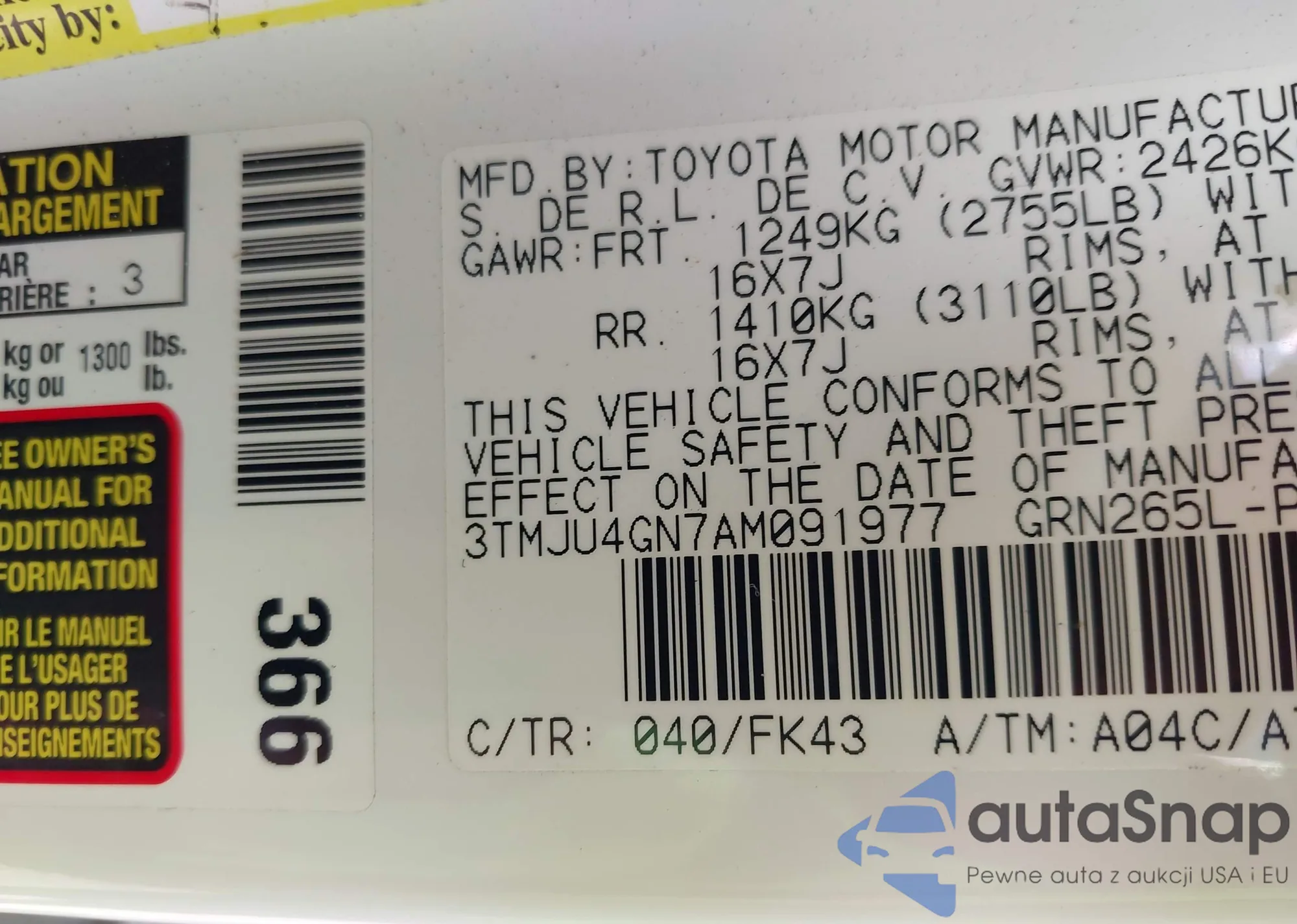 • VIN 4T1BF1FK7EU310289