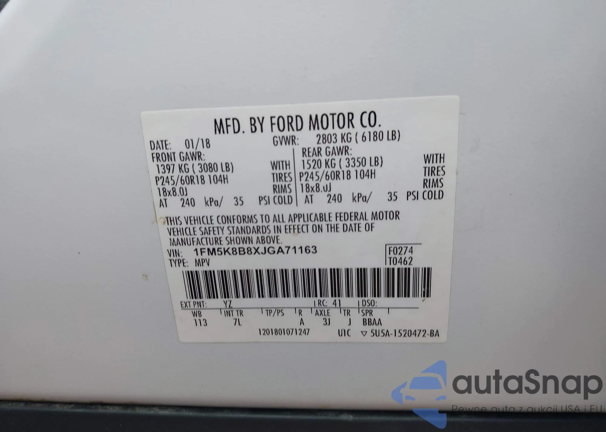 LOT: 43031150 VIN: 1FM5K8B8XJGA71163