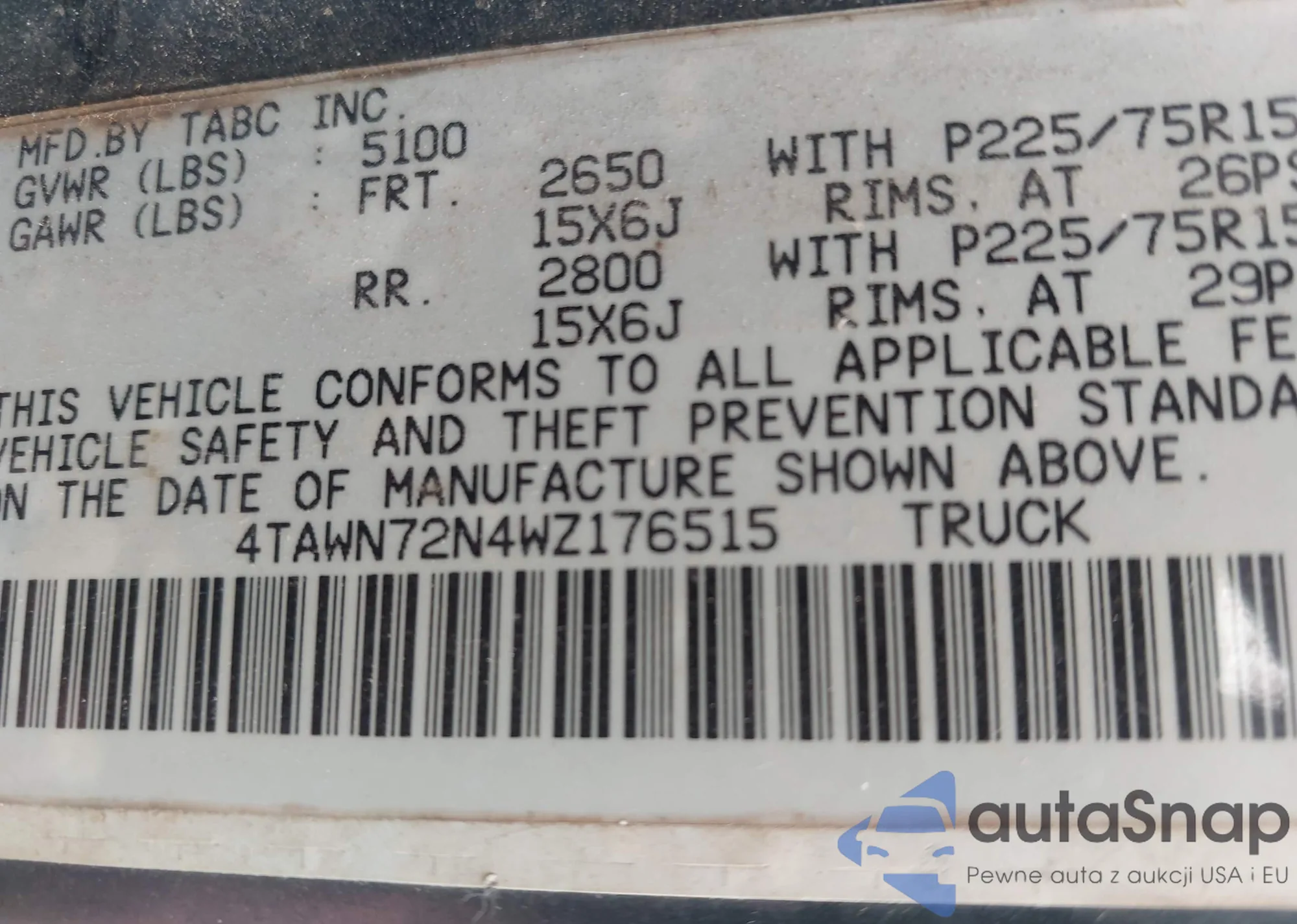 • VIN 4TAWN72N4WZ176515