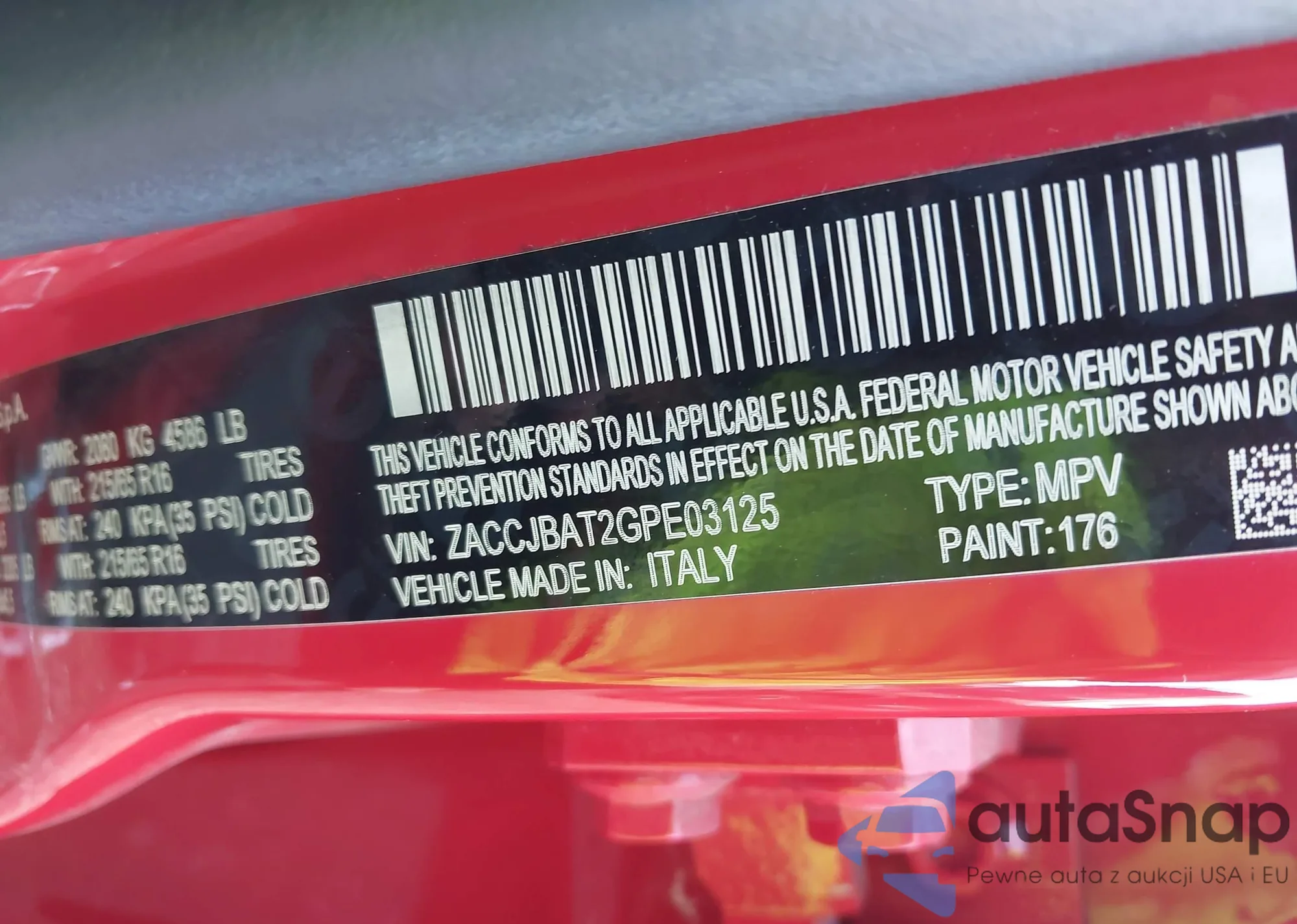 LOT: 43304175 VIN: ZACCJBAT2GPE03125
