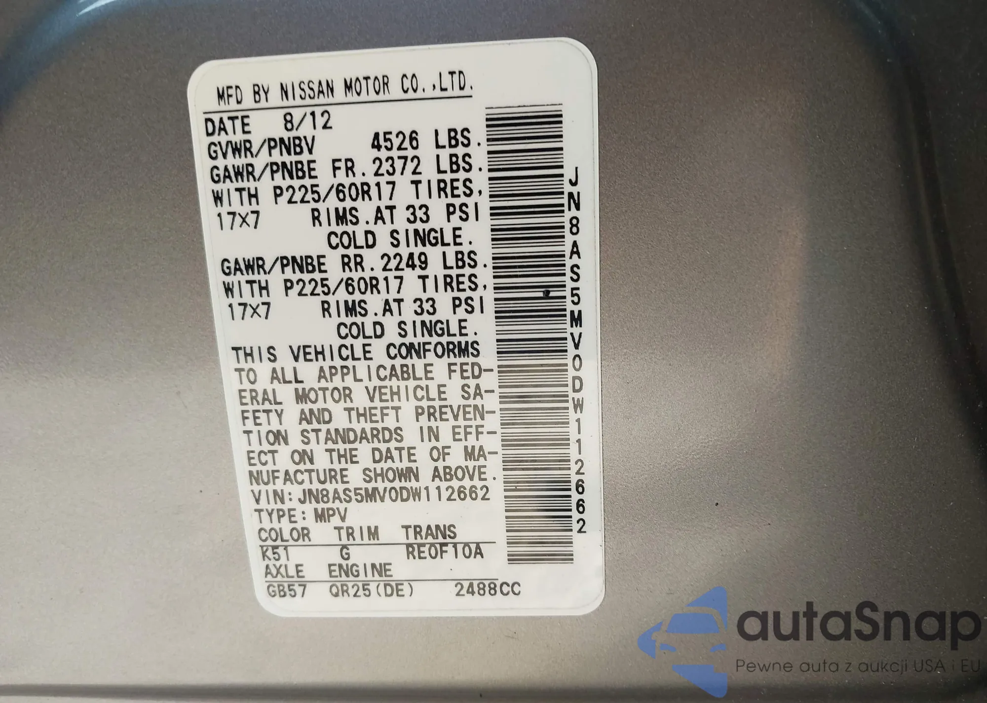 • VIN JN8AS5MV0DW112662