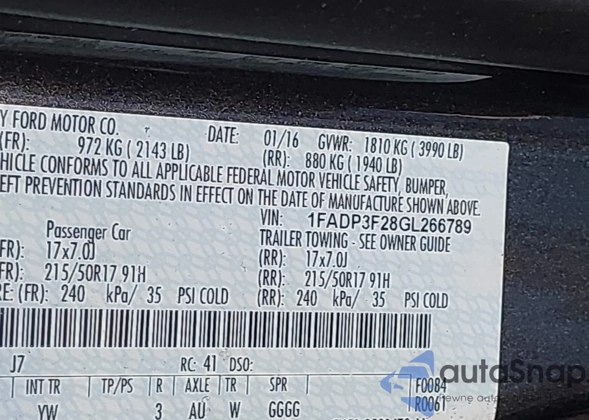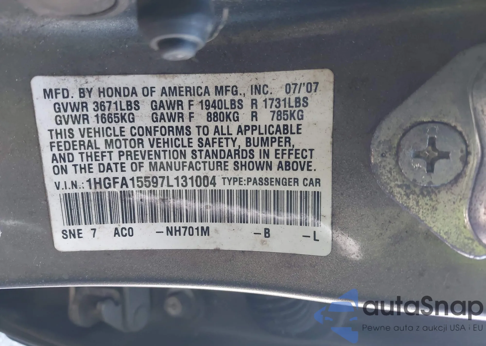 LOT: 43343841 VIN: 1HGFA15597L131004