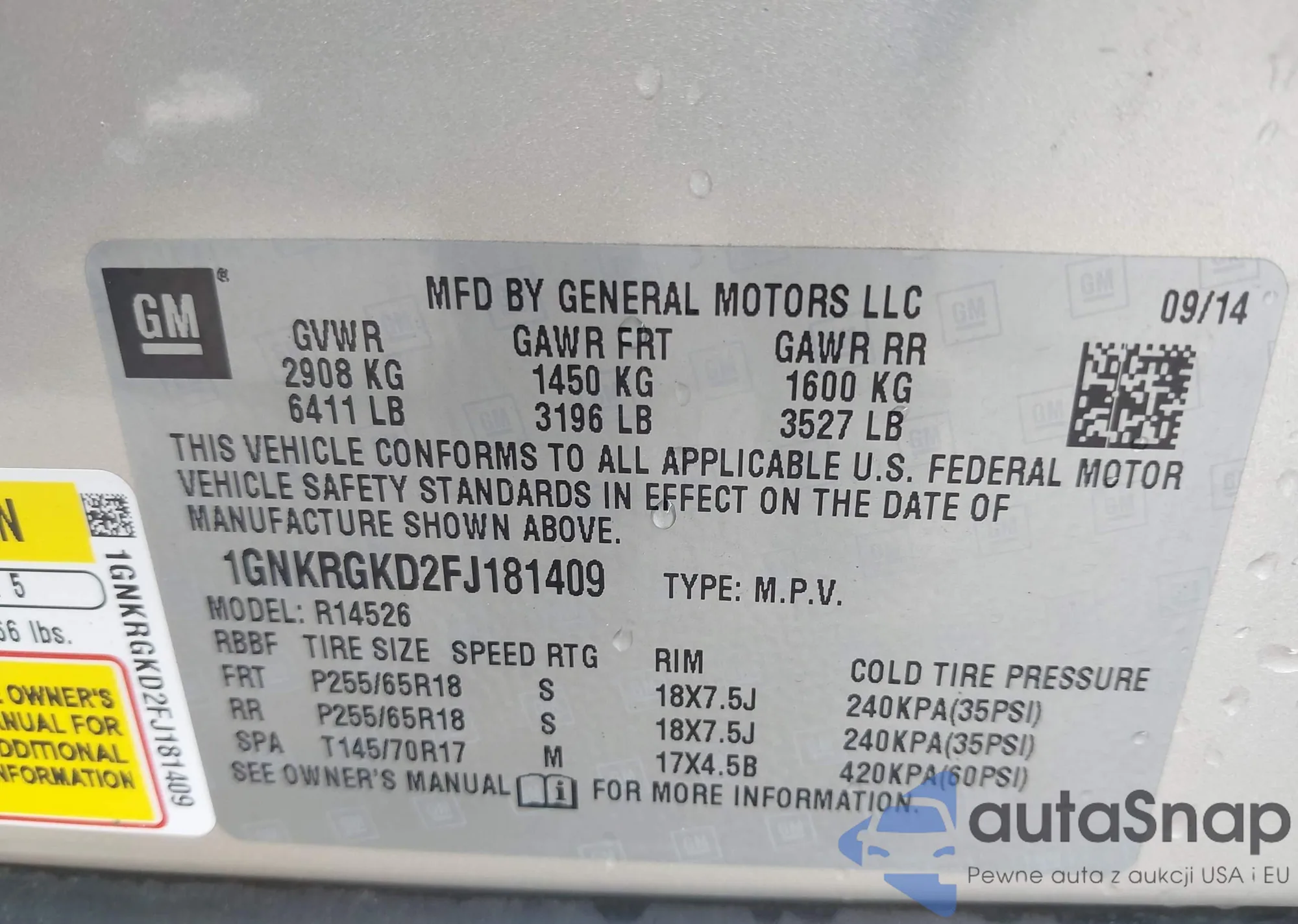LOT: 43181410 VIN: 1GNKRGKD2FJ181409