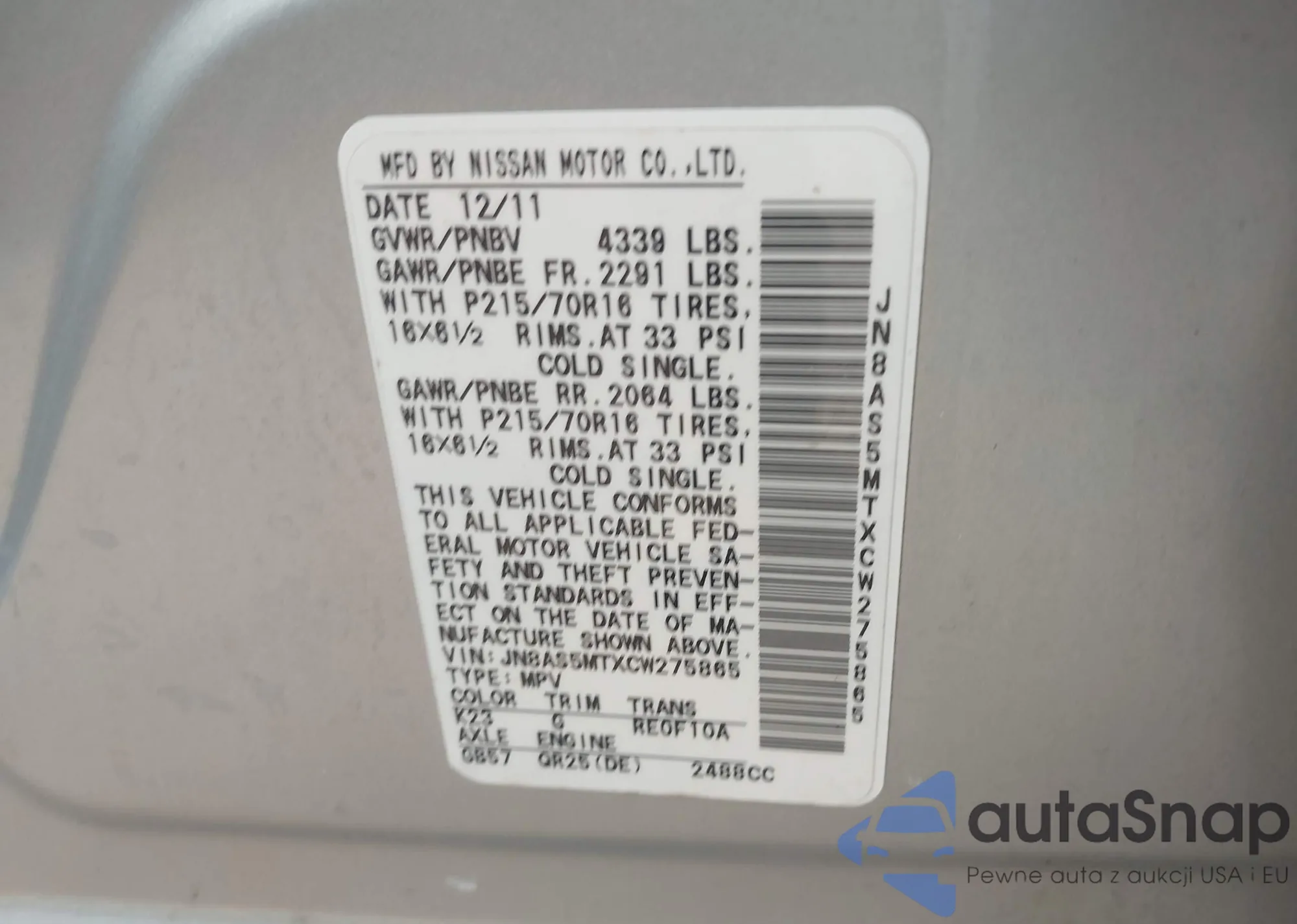 LOT: 43227806 VIN: JN8AS5MTXCW275865