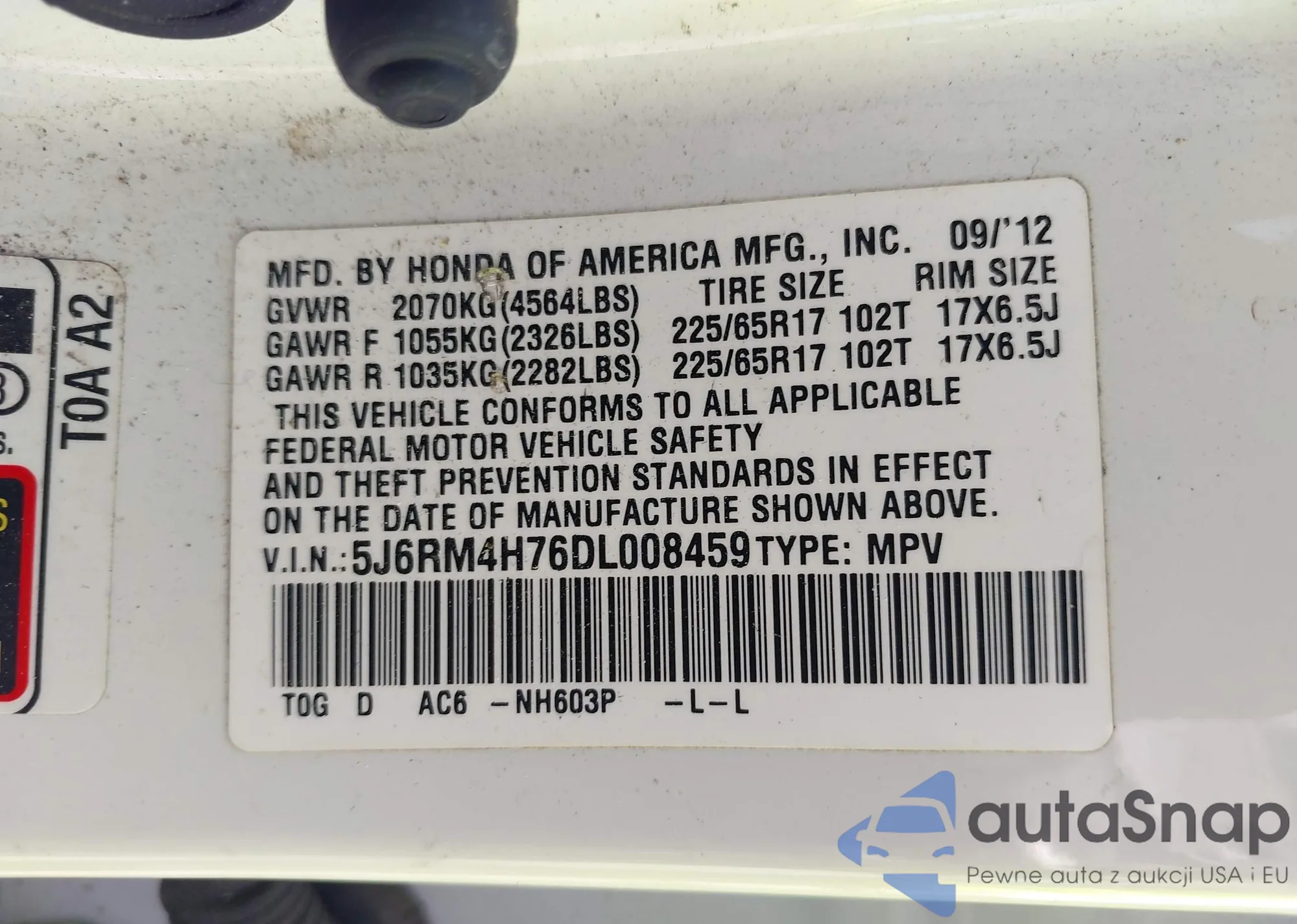 • VIN 5J6RM4H76DL008459