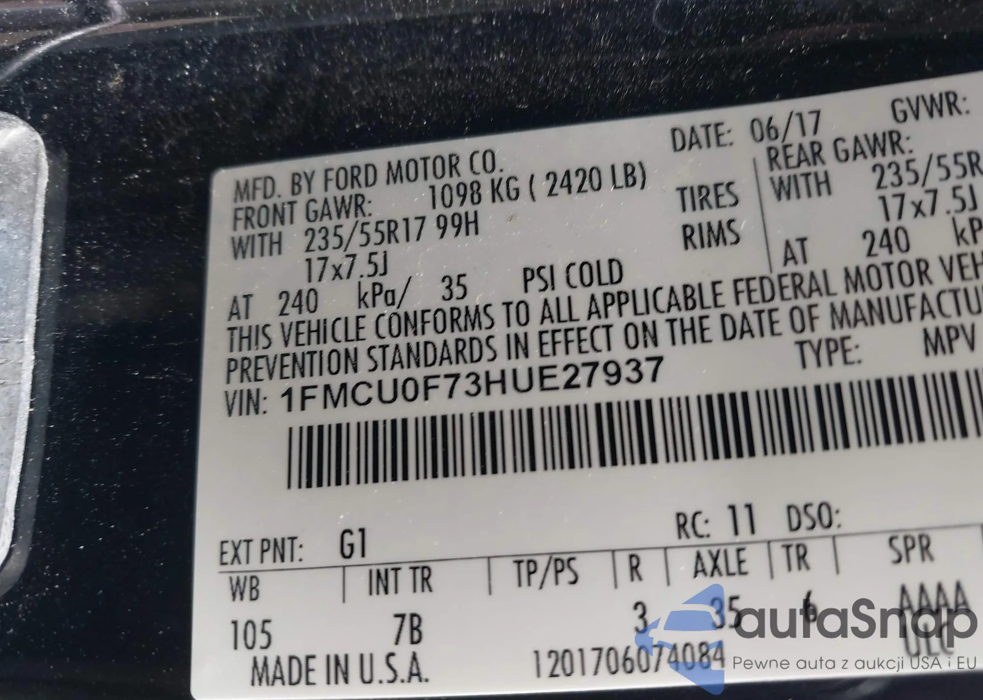 LOT: 42995918 VIN: 1FMCU0F73HUE27937