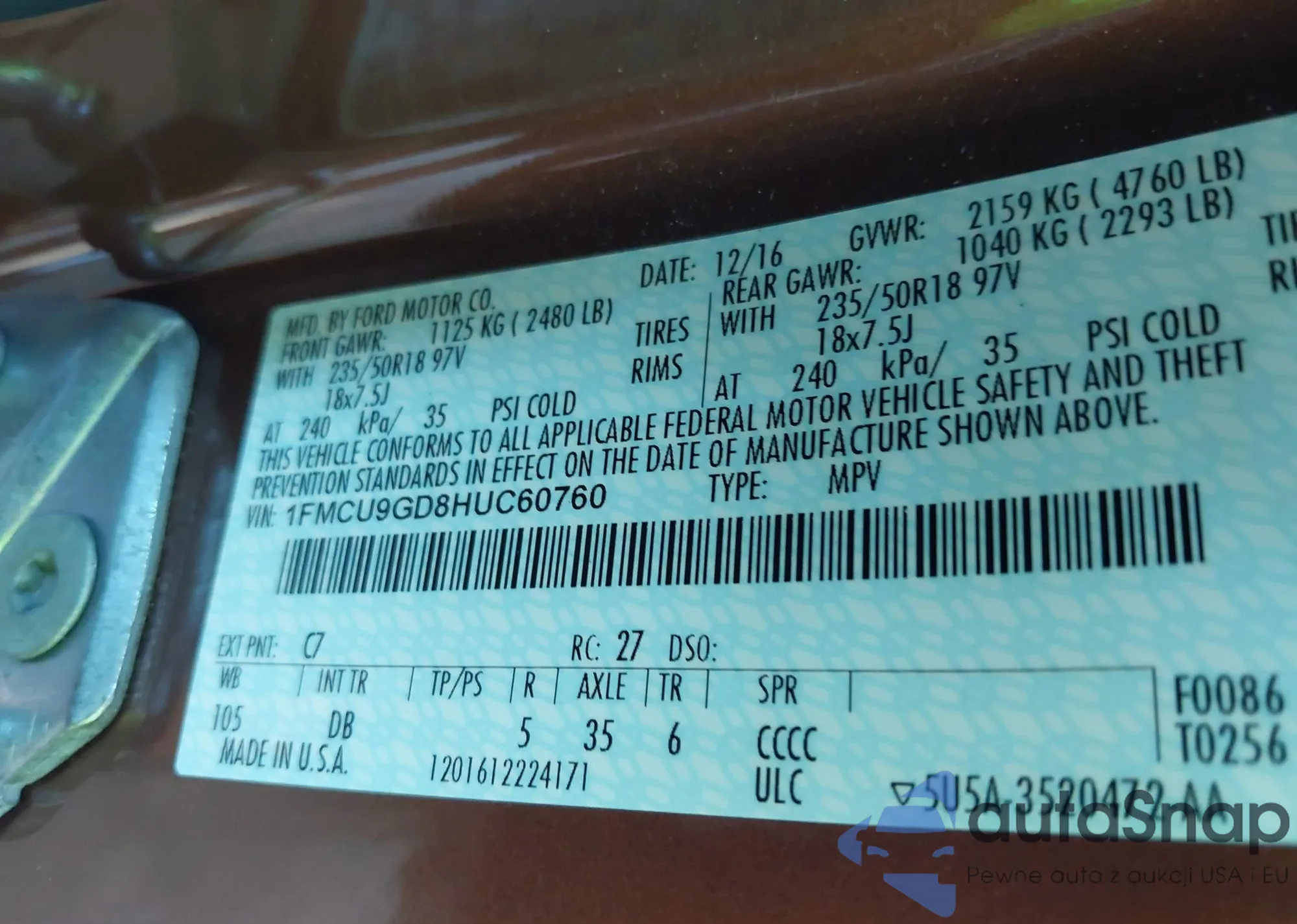 • VIN 1FMCU9GD8HUC60760