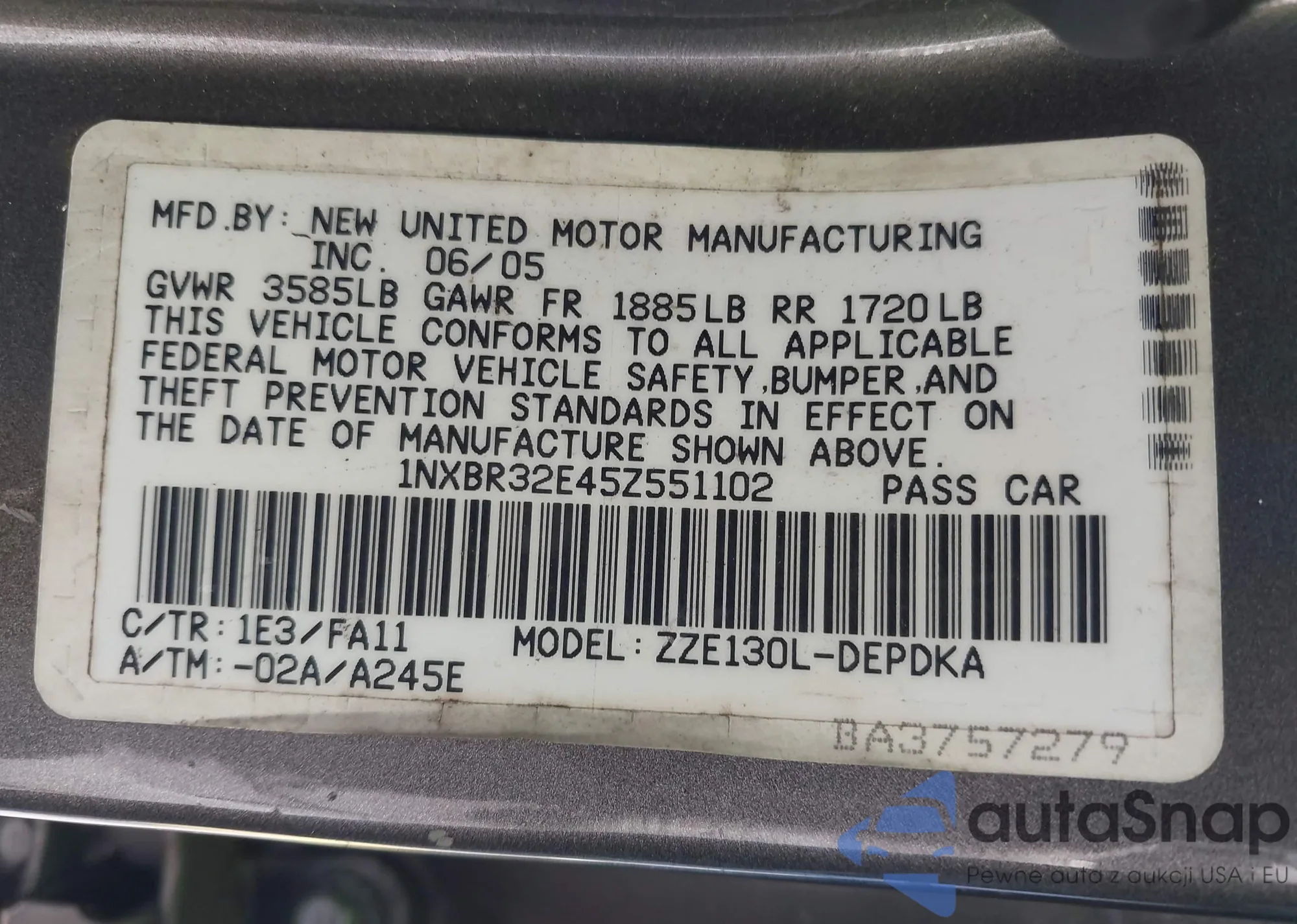 LOT: 43265411 VIN: 1NXBR32E45Z551102