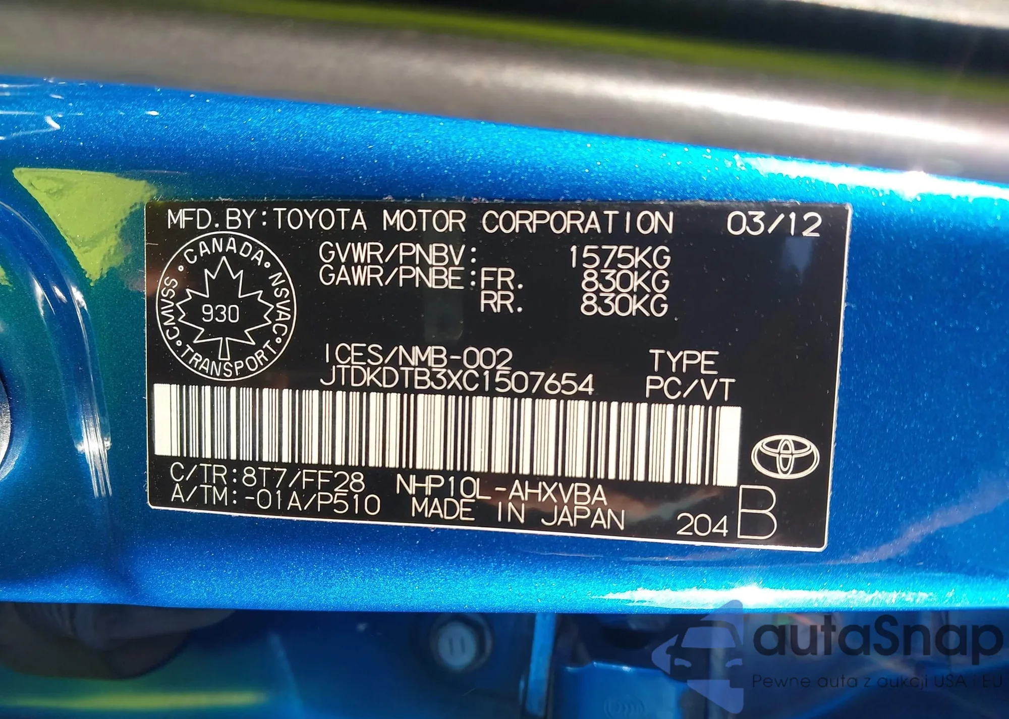 • VIN JTDKDTB3XC1507654