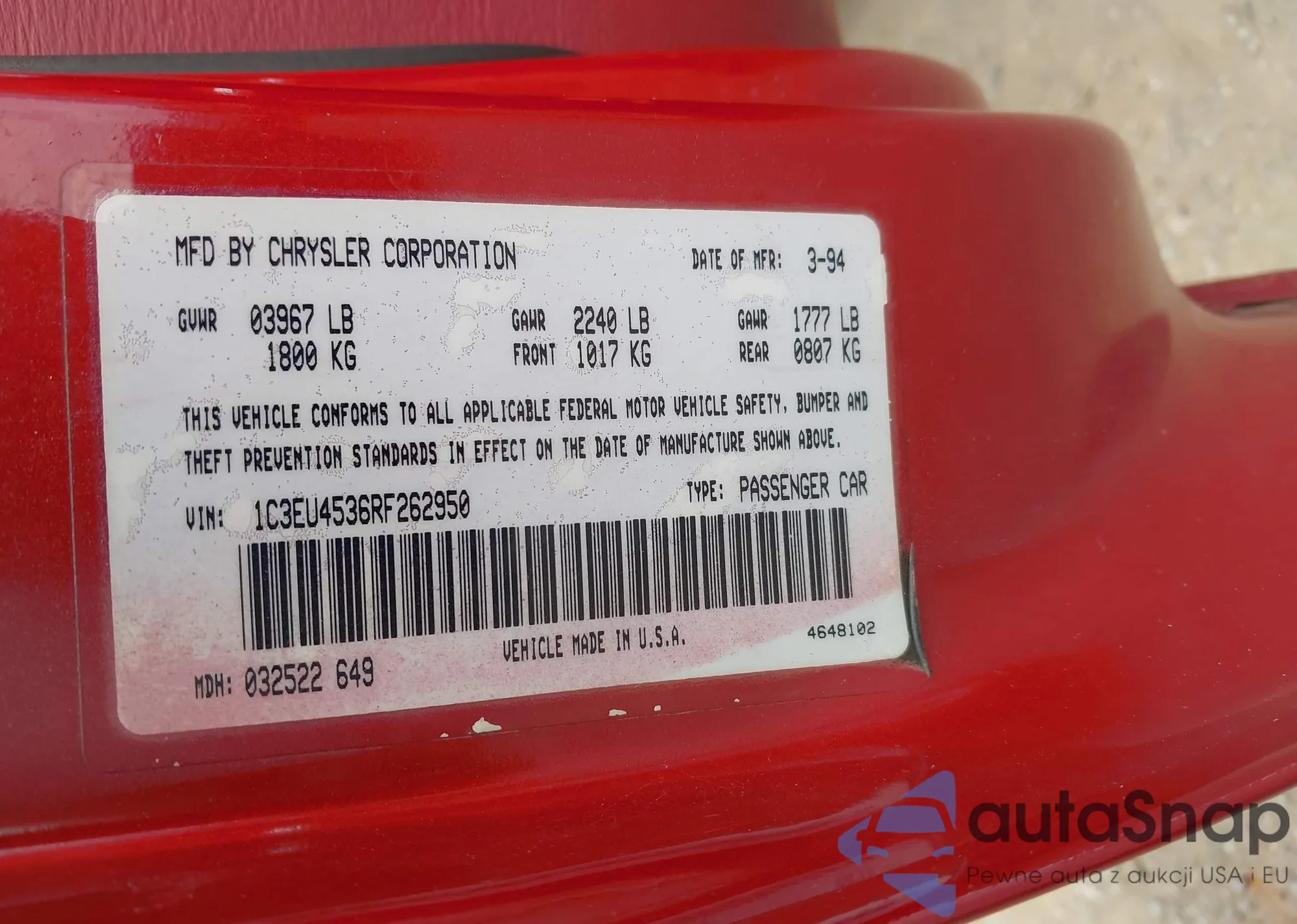LOT: 43201721 VIN: 1C3EU4536RF262950