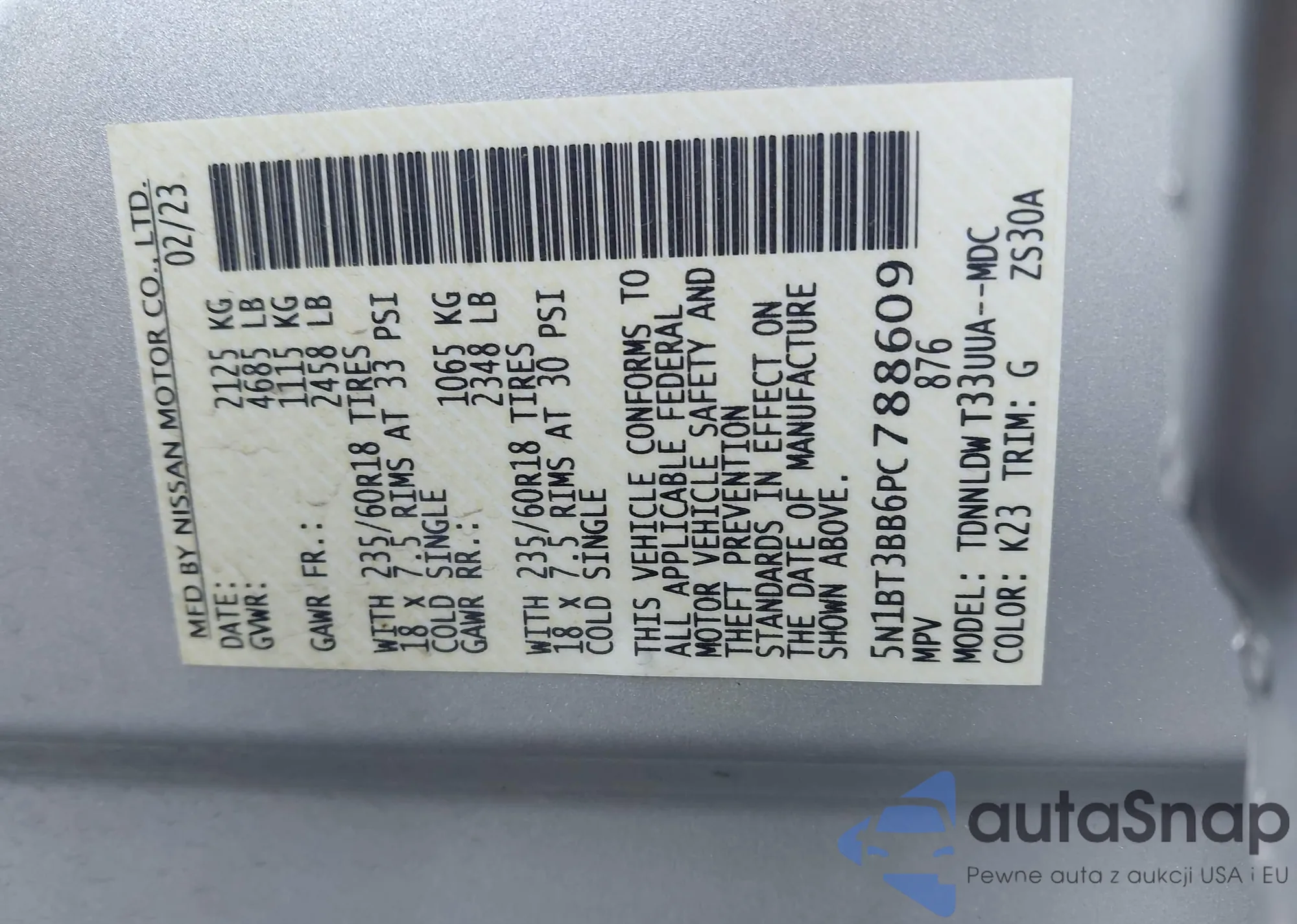 LOT: 43247407 VIN: 5N1BT3BB6PC788609