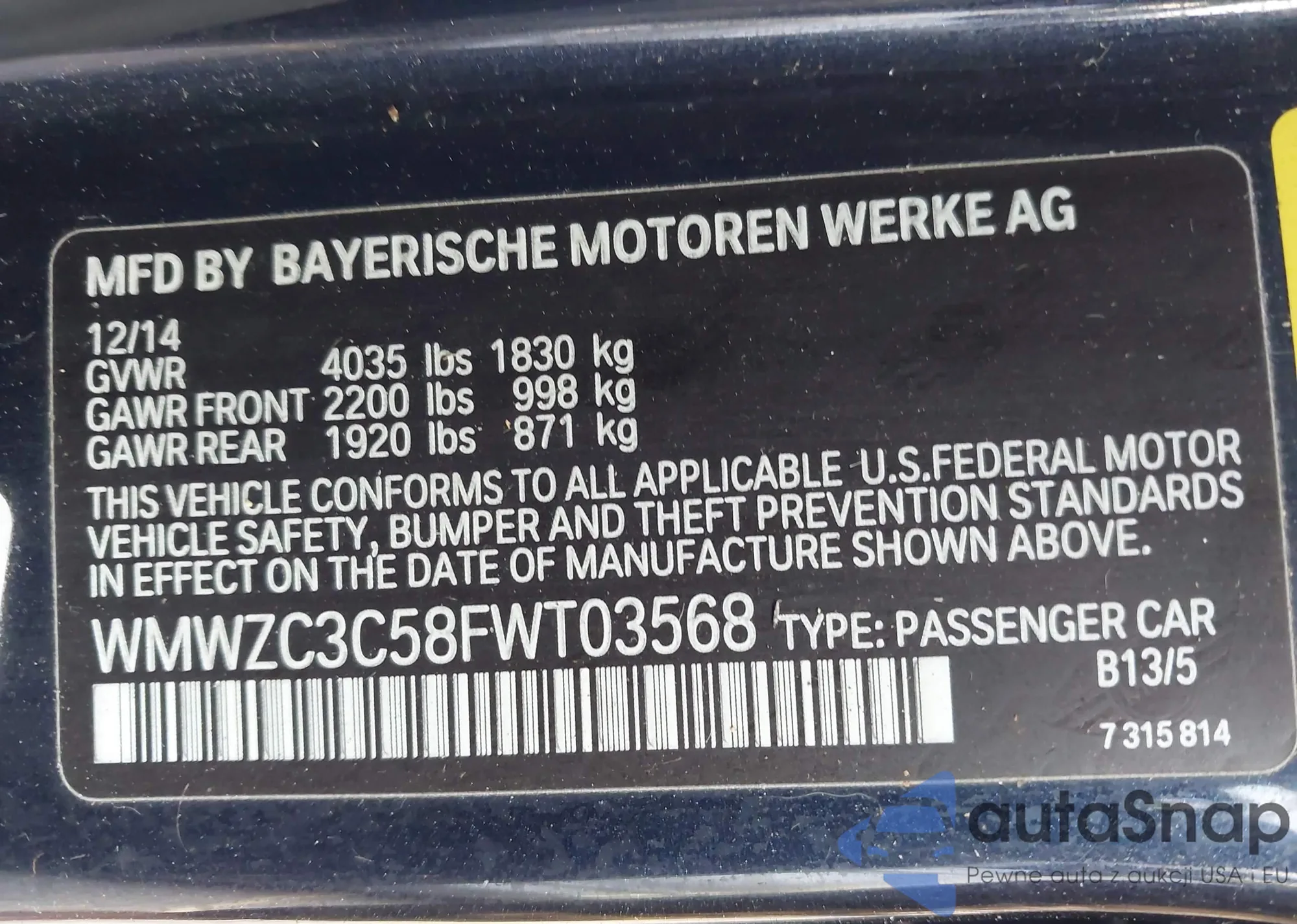 LOT: 43378593 VIN: WMWZC3C58FWT03568