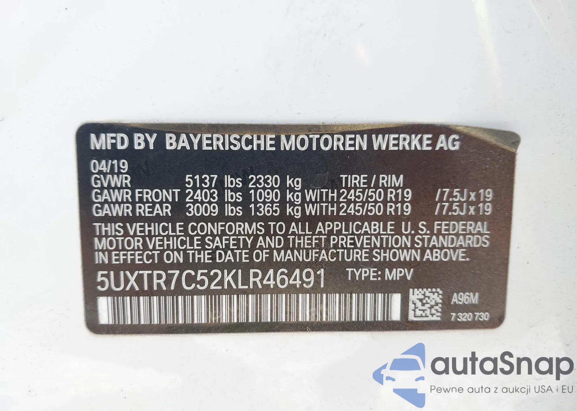 LOT: 43206297 VIN: 5UXTR7C52KLR46491