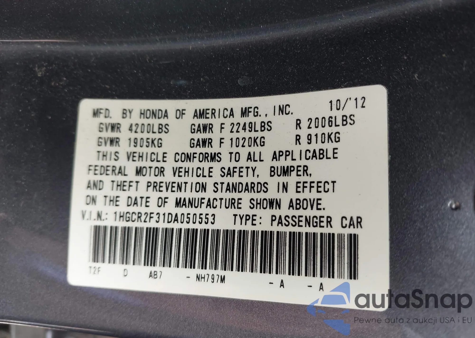 • VIN 1HGCR2F31DA050553