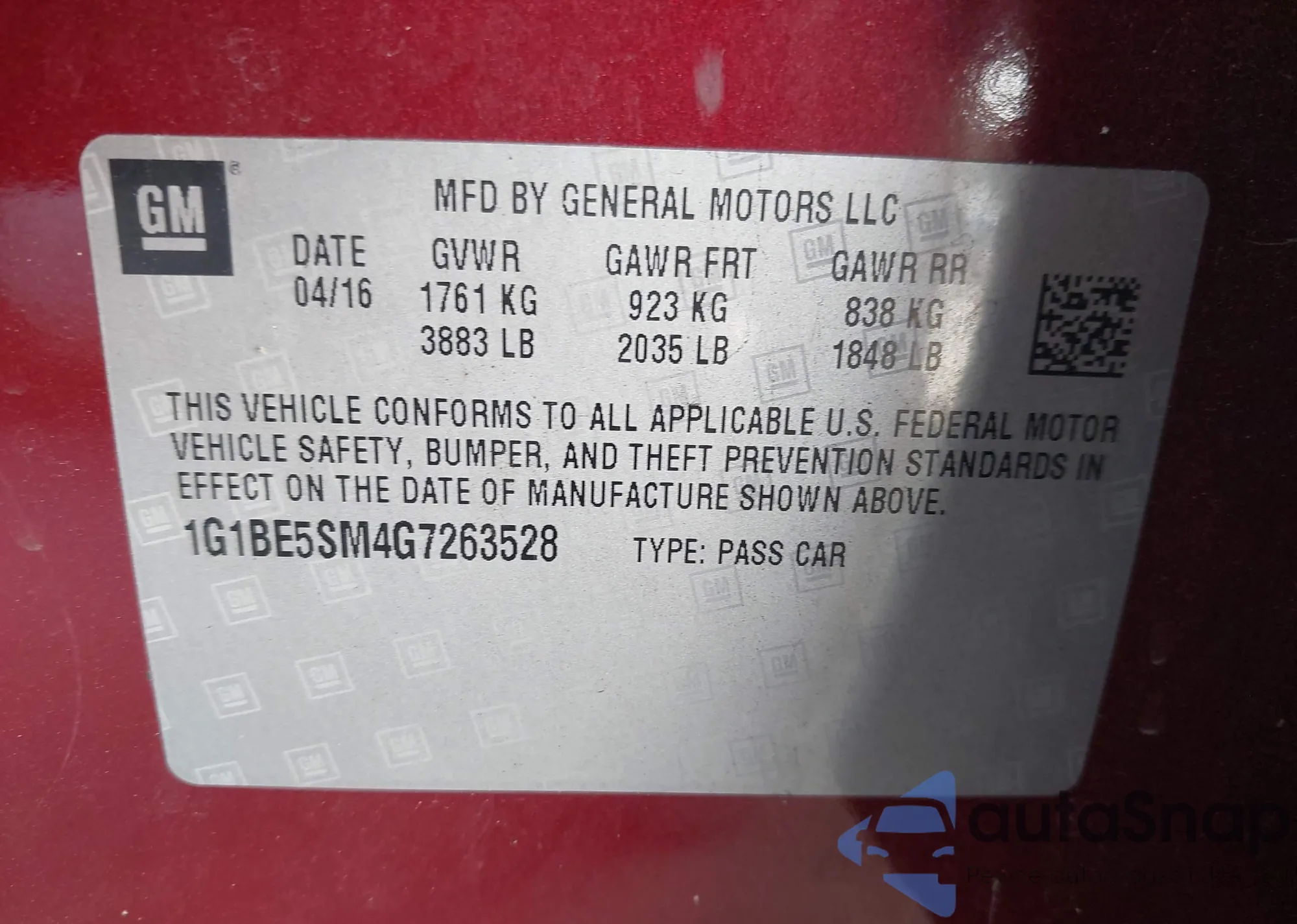 LOT: 43364820 VIN: 1G1BE5SM4G7263528