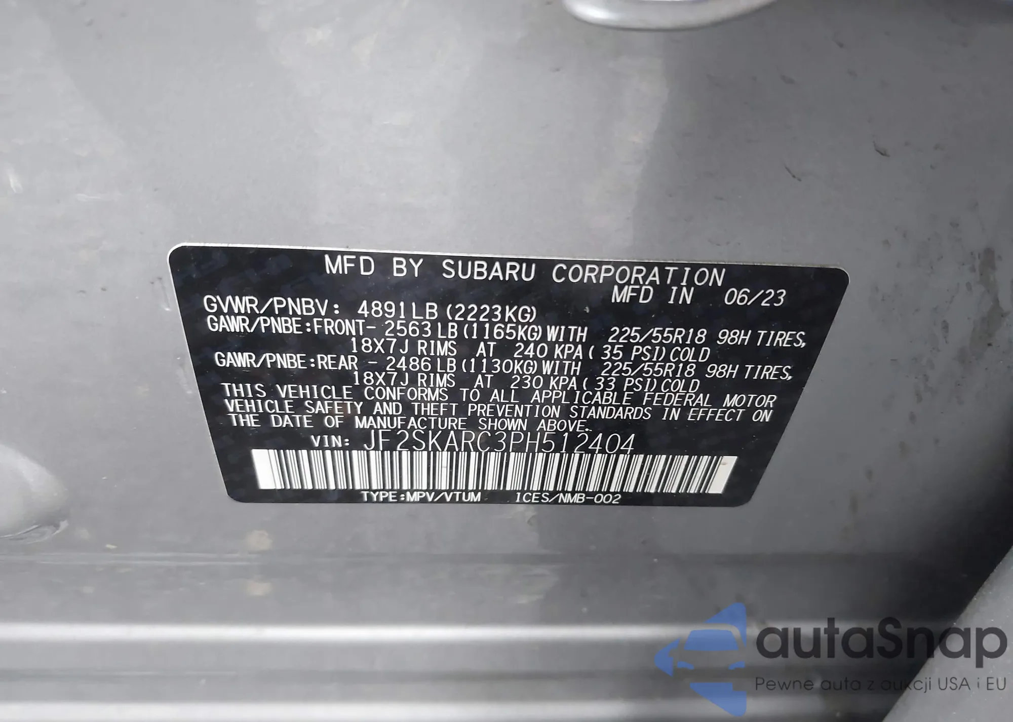 LOT: 43391566 VIN: JF2SKARC3PH512404