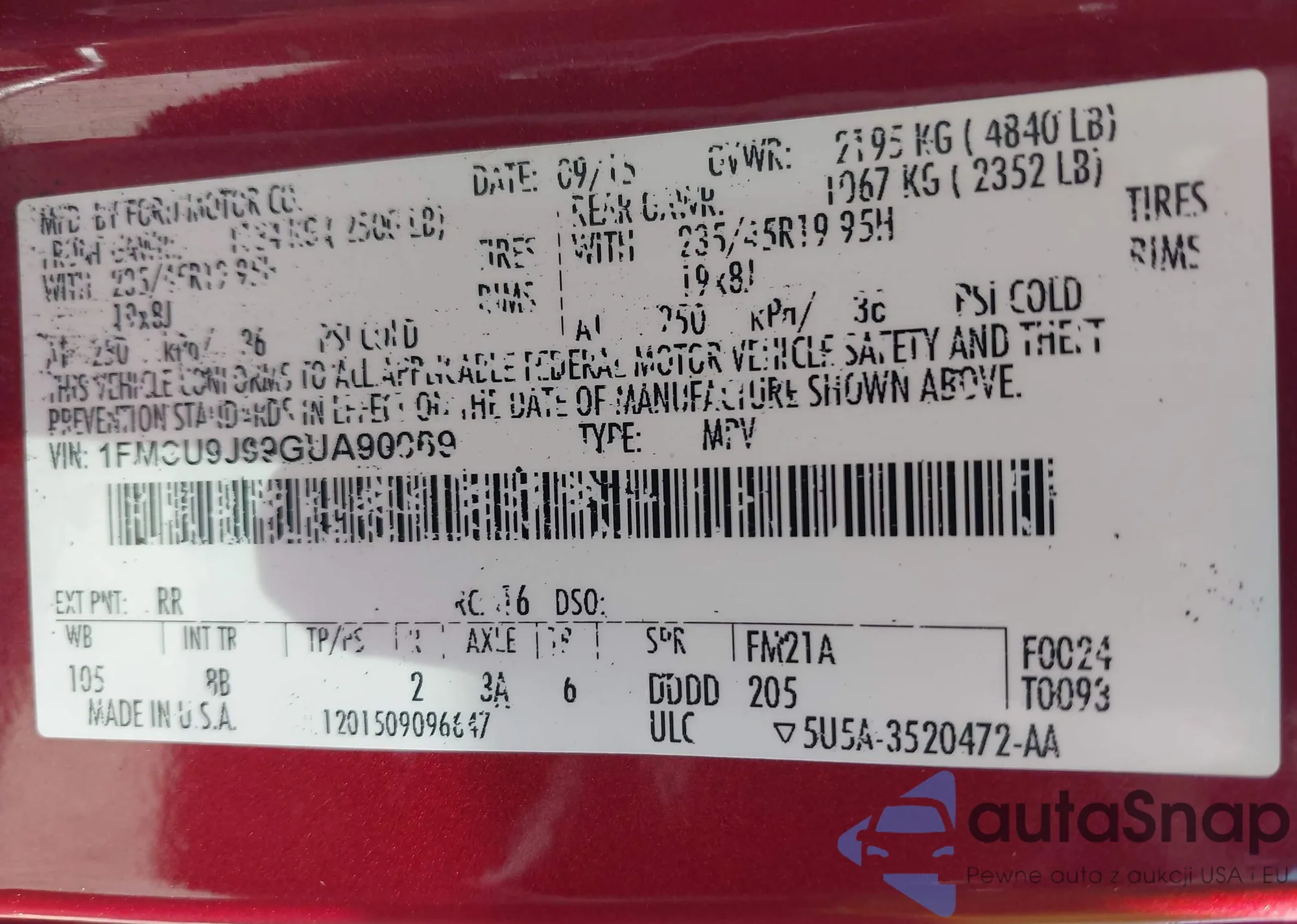 LOT: 43087910 VIN: 1FMCU9J99GUA90069