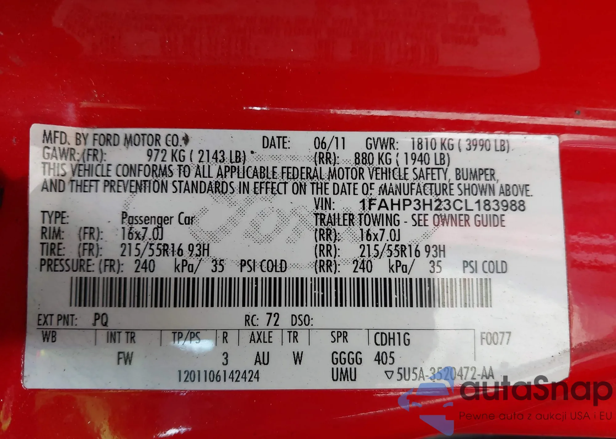 LOT: 43169627 VIN: 1FAHP3H23CL183988
