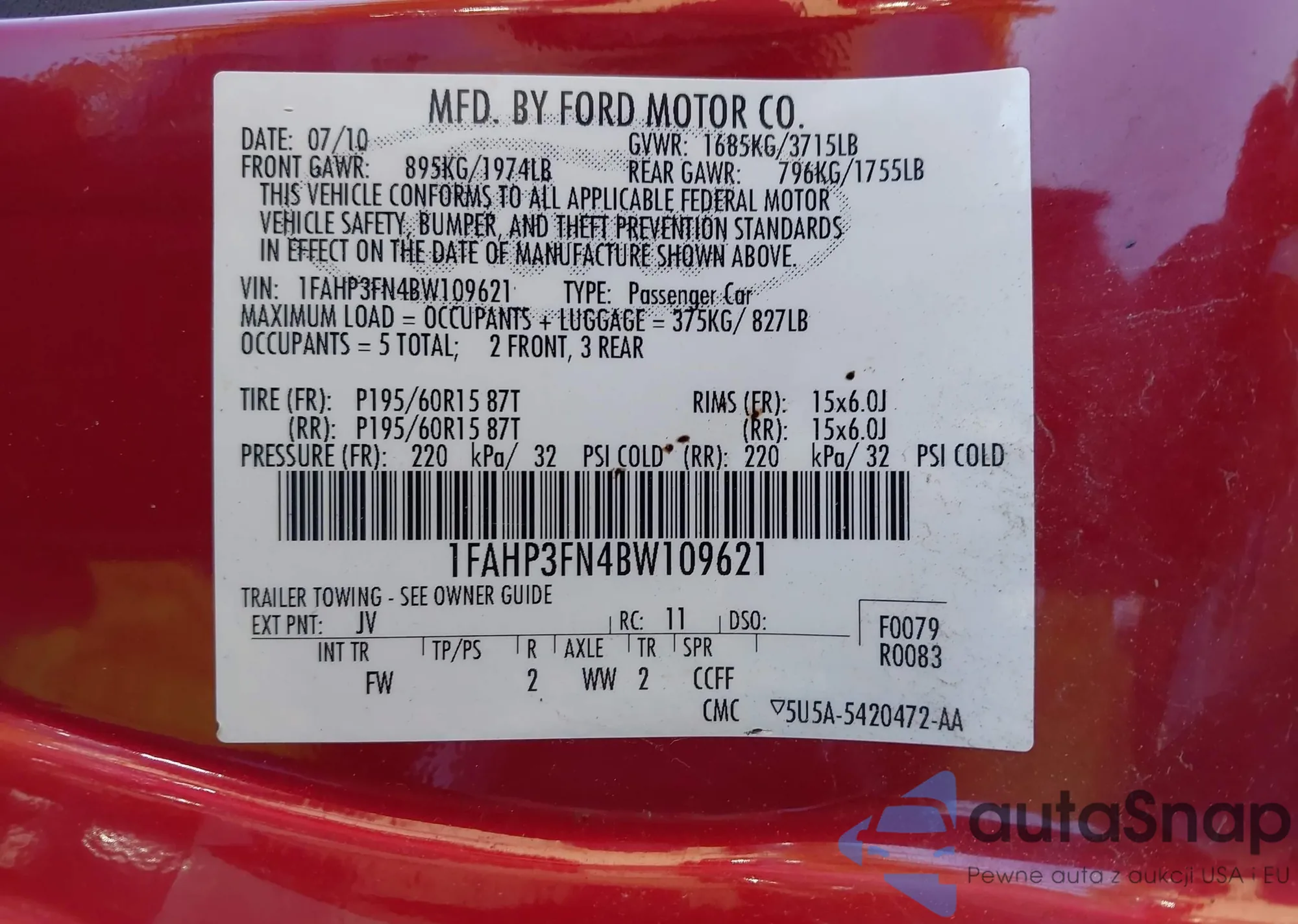 • VIN 1FAHP3FN4BW109621