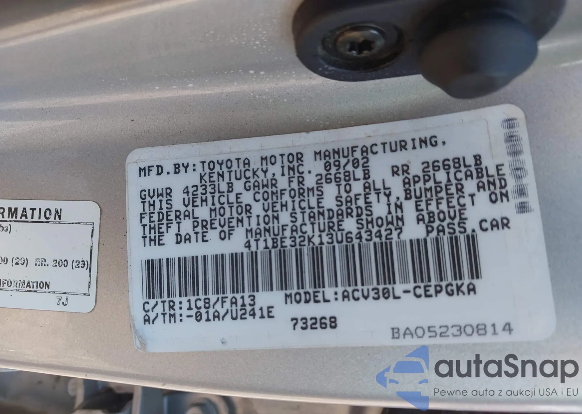 LOT: 43280522 VIN: 4T1BE30K94U793984