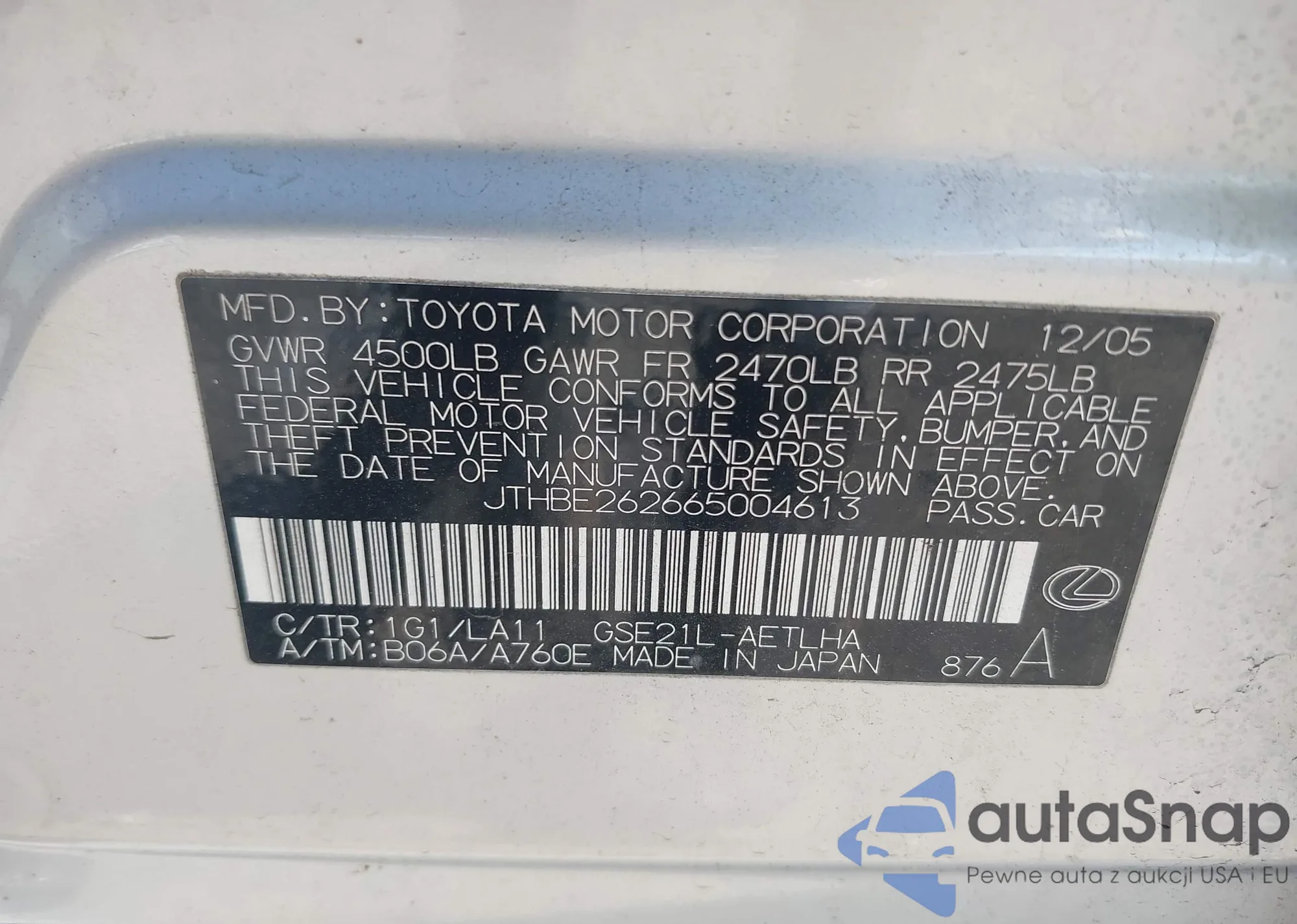 LOT: 43277461 VIN: JTHBE262665004613