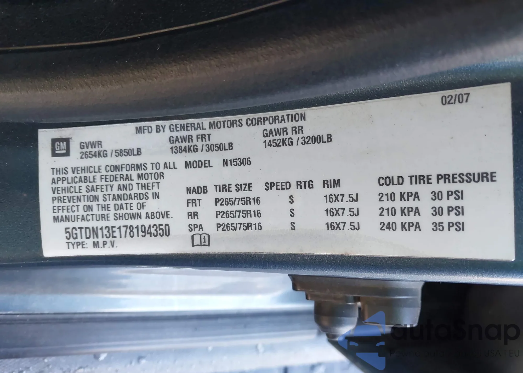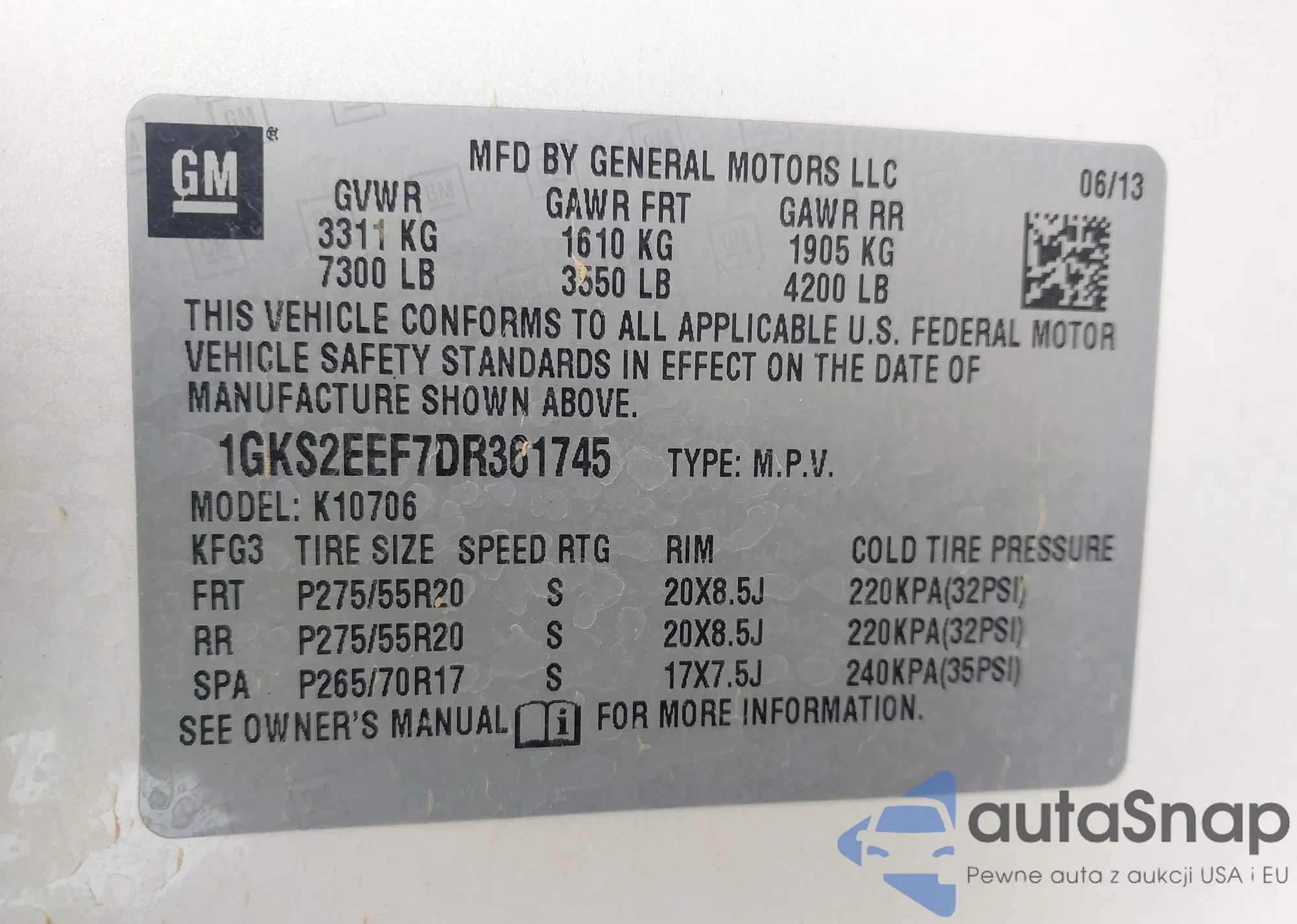 LOT: 43226207 VIN: 1GKS2EEF7DR361745