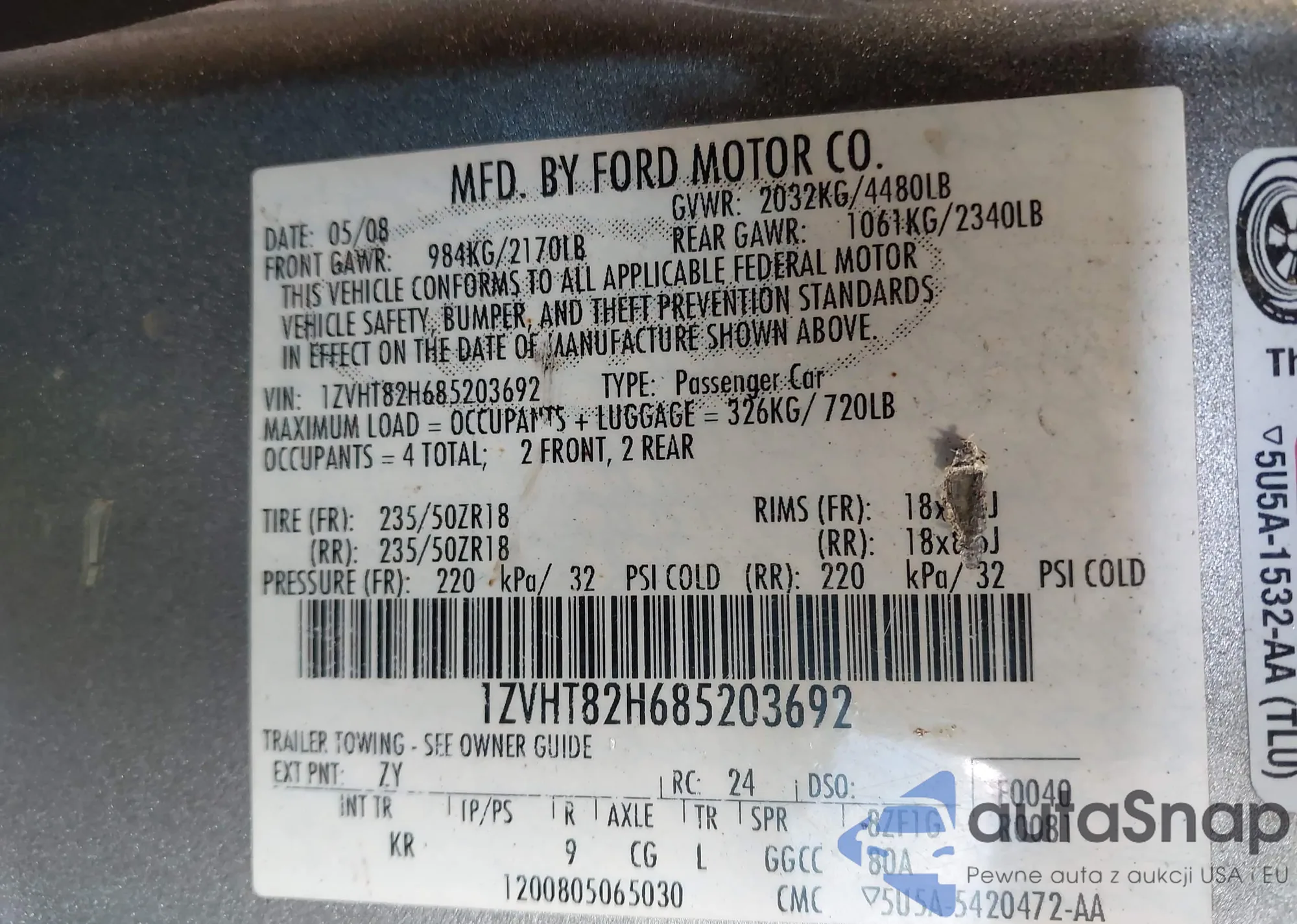 LOT: 42881457 VIN: 1ZVHT82H685203692