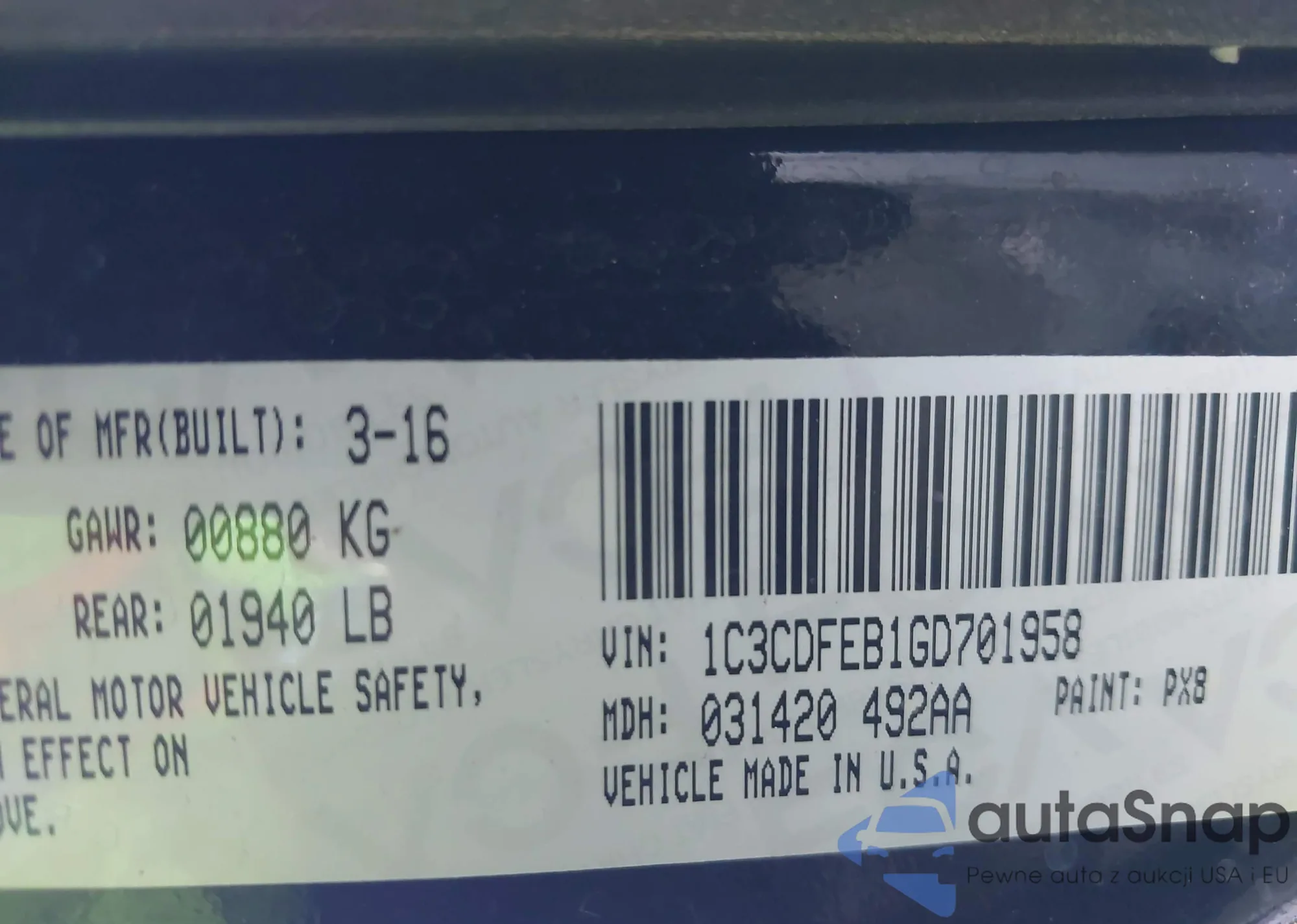 LOT: 42970357 VIN: 1C3CDFEB1GD701958