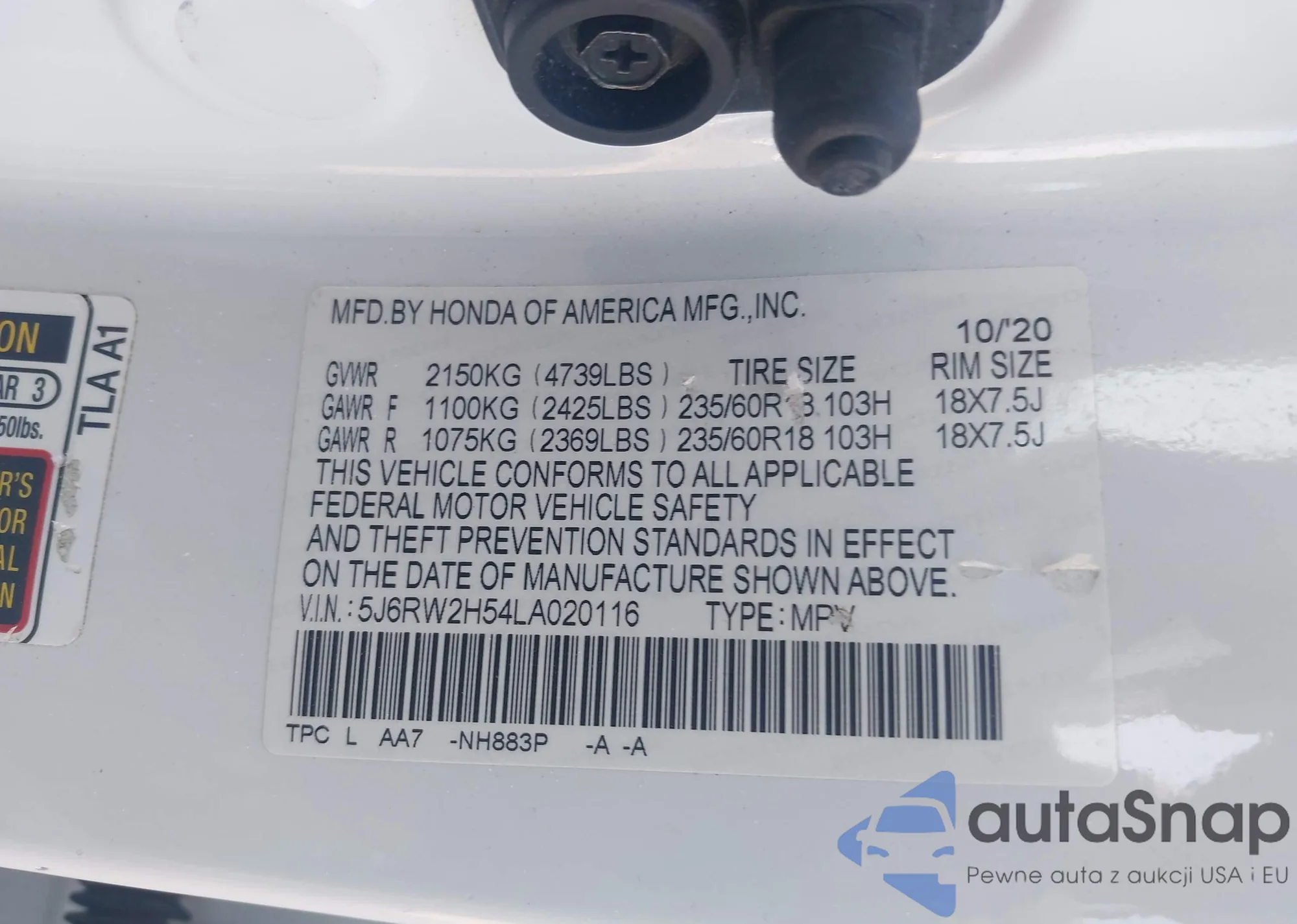 • VIN 5J6RW2H54LA020116