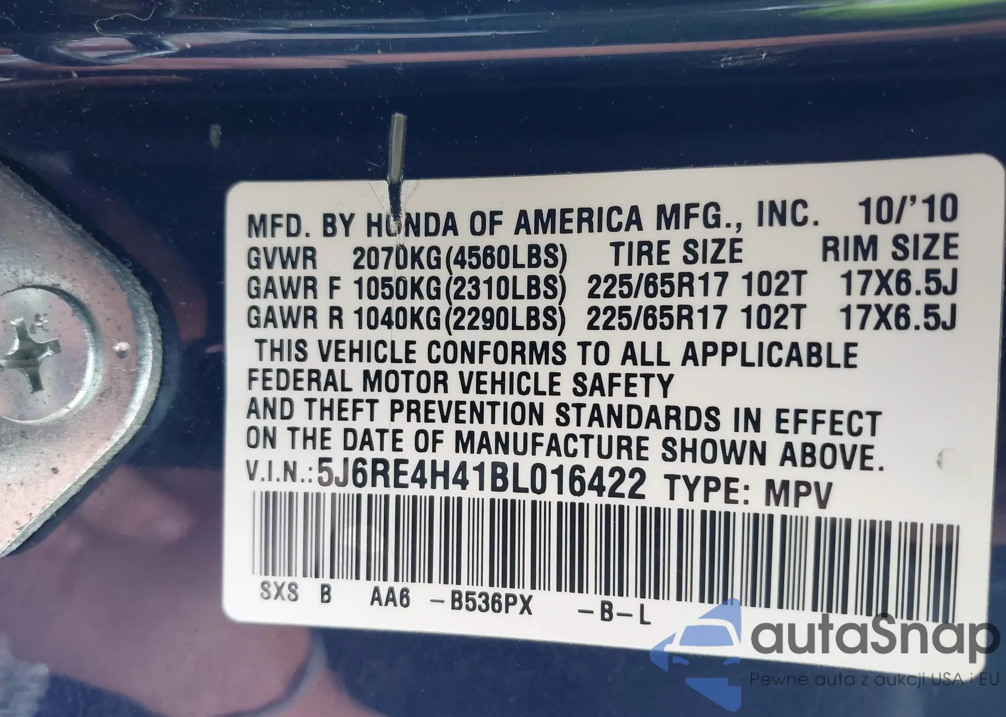 • VIN 5J6RE4H41BL016422