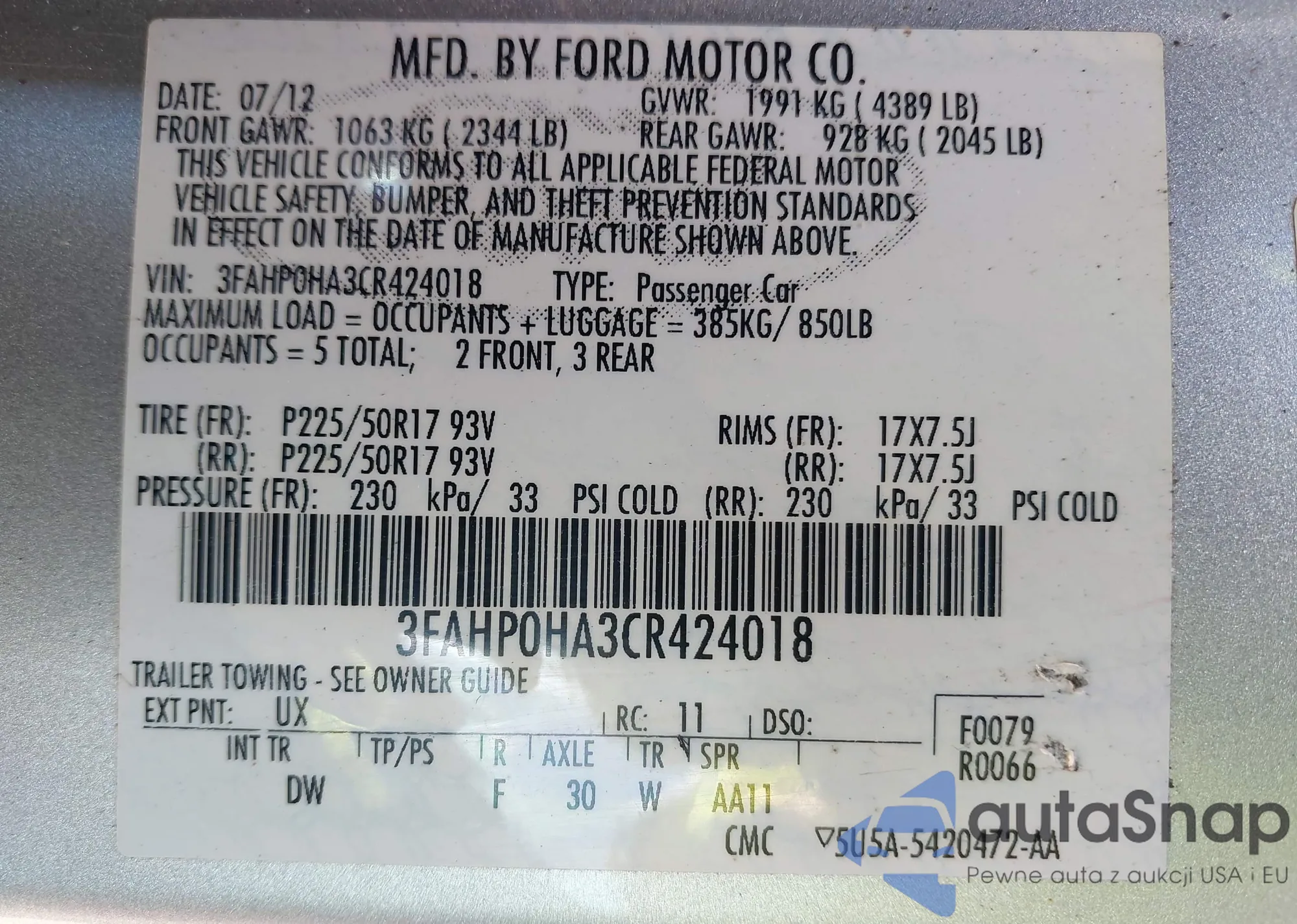 • VIN 3FAHP0HA3CR424018