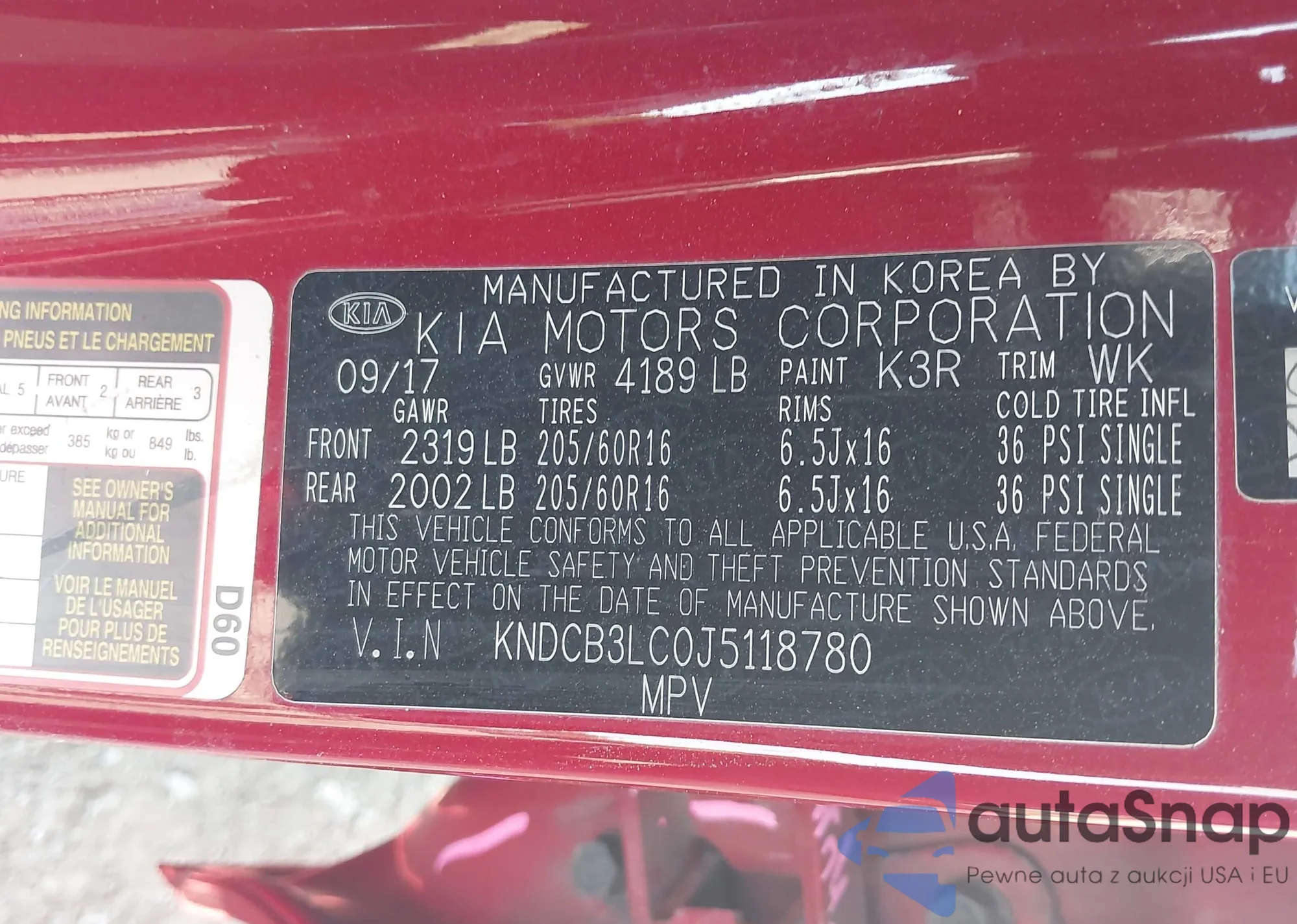 • VIN KNDCB3LC0J5118780