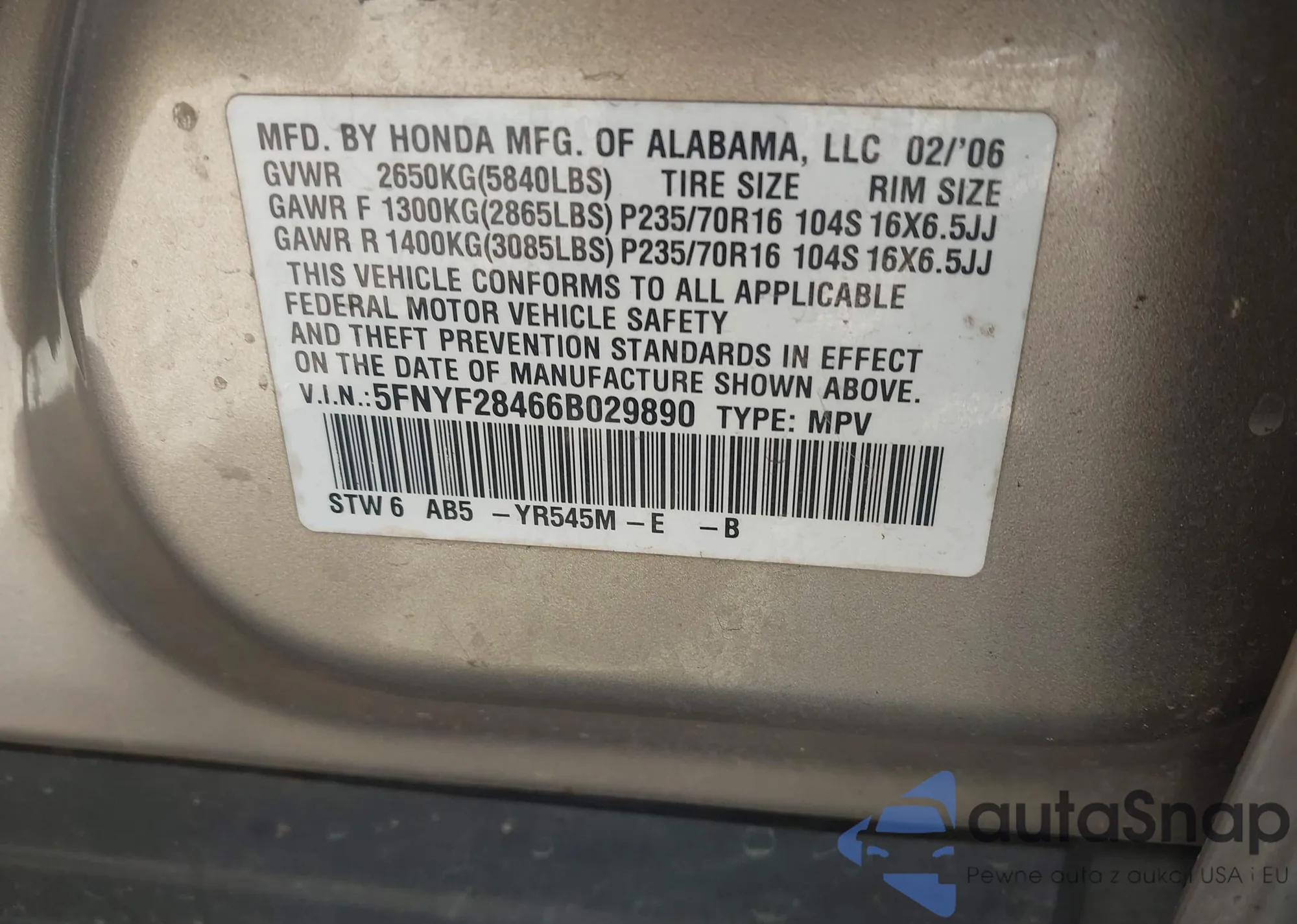 LOT: 43283669 VIN: 5FNYF28466B029890