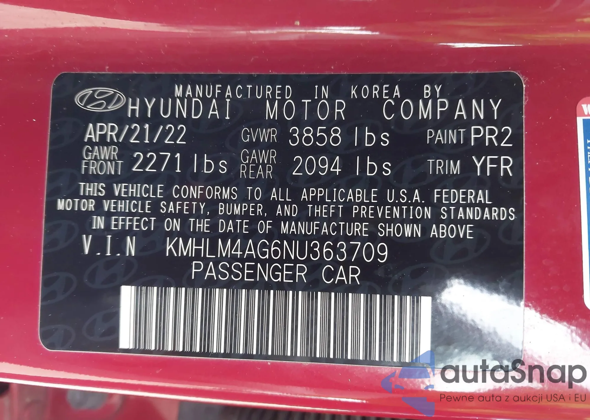 • VIN KMHLM4AG6NU363709
