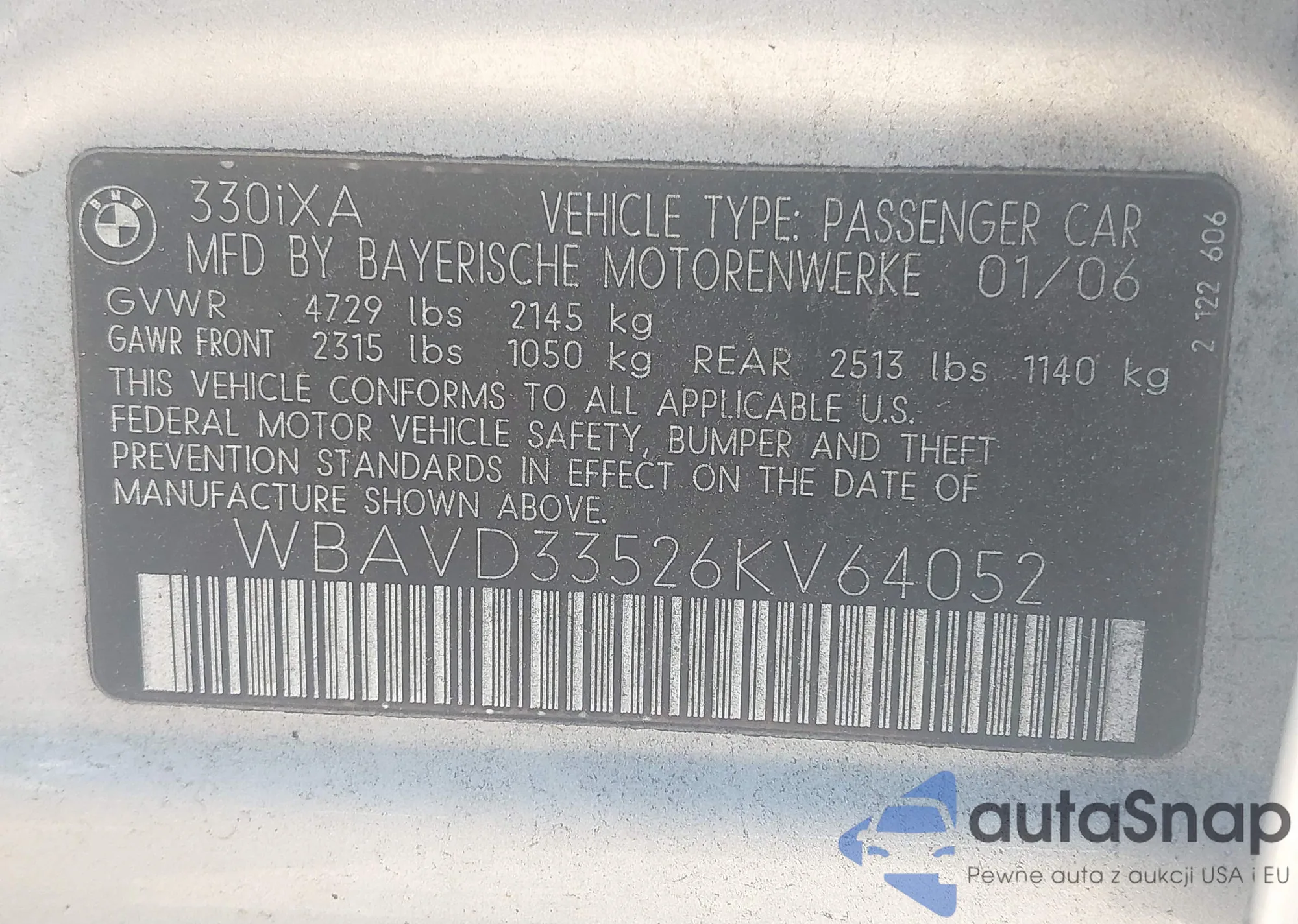 LOT: 43331706 VIN: WBAVD33526KV64052