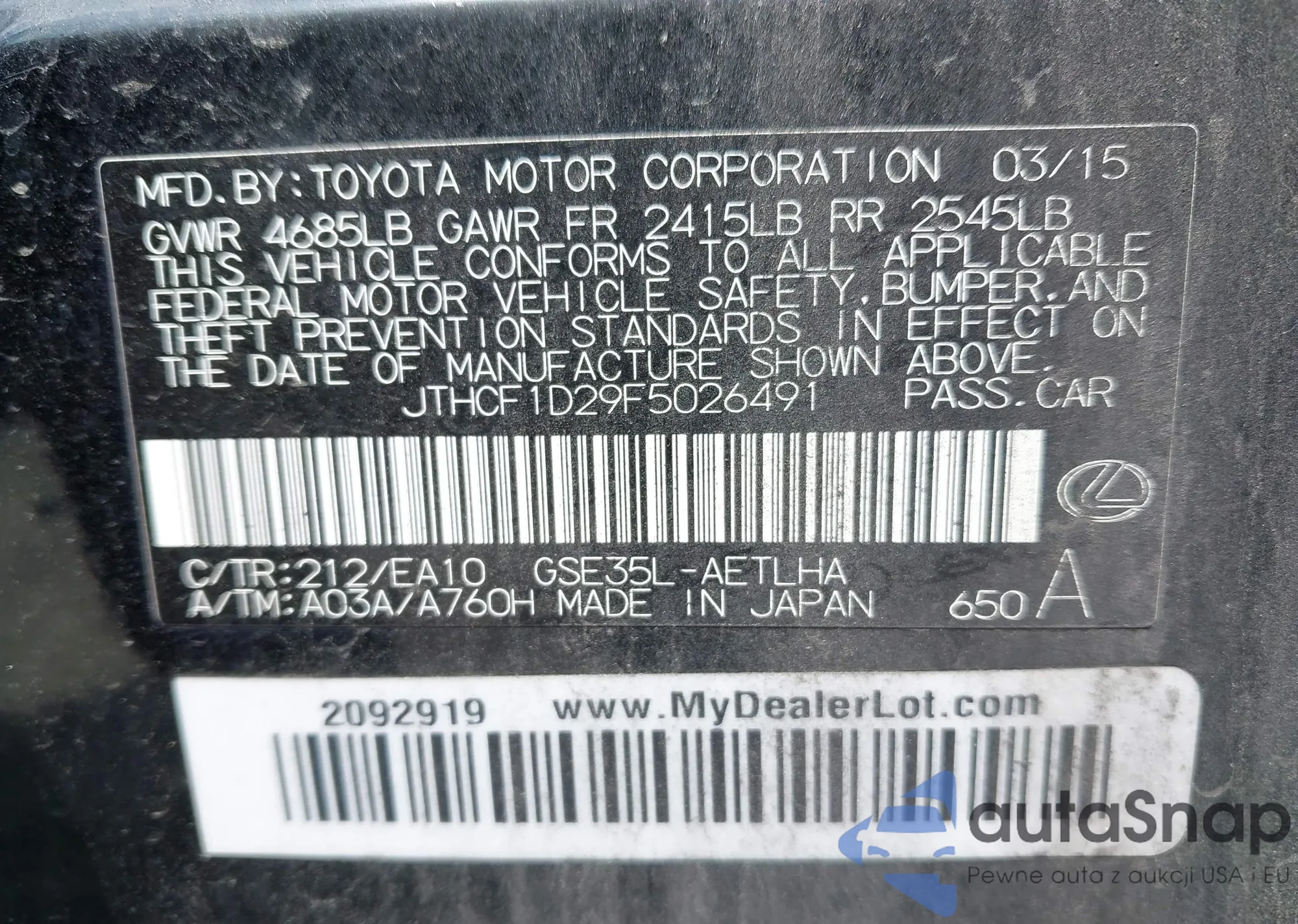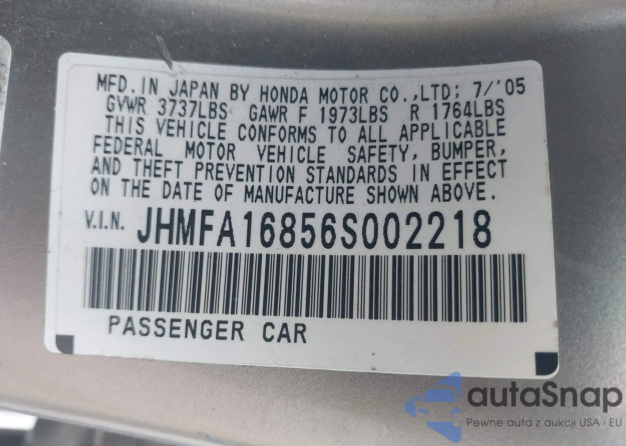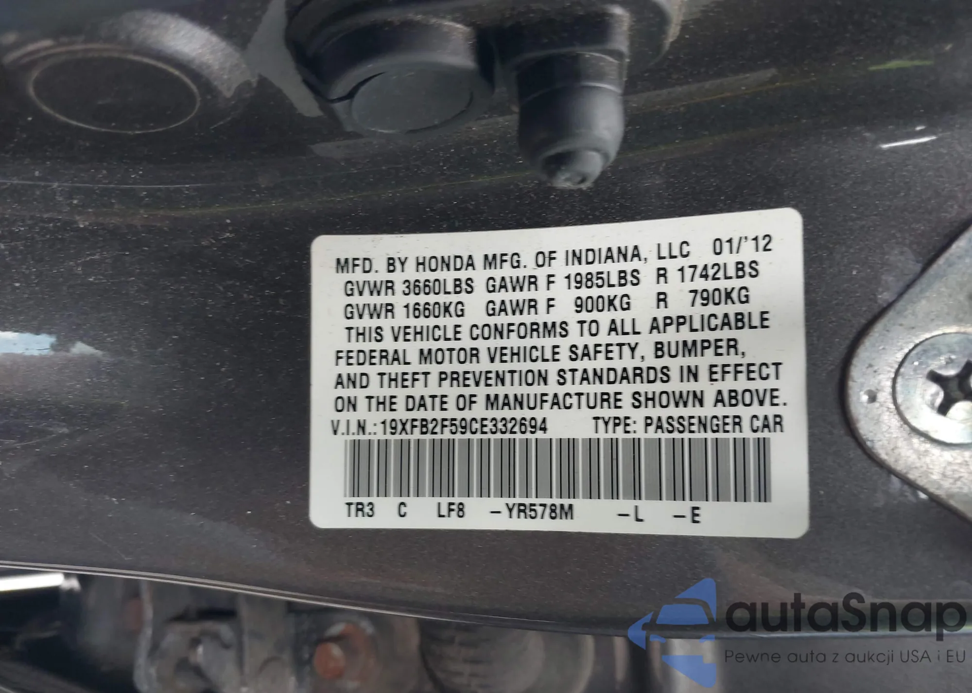 LOT: 43072103 VIN: 19XFB2F59CE332694