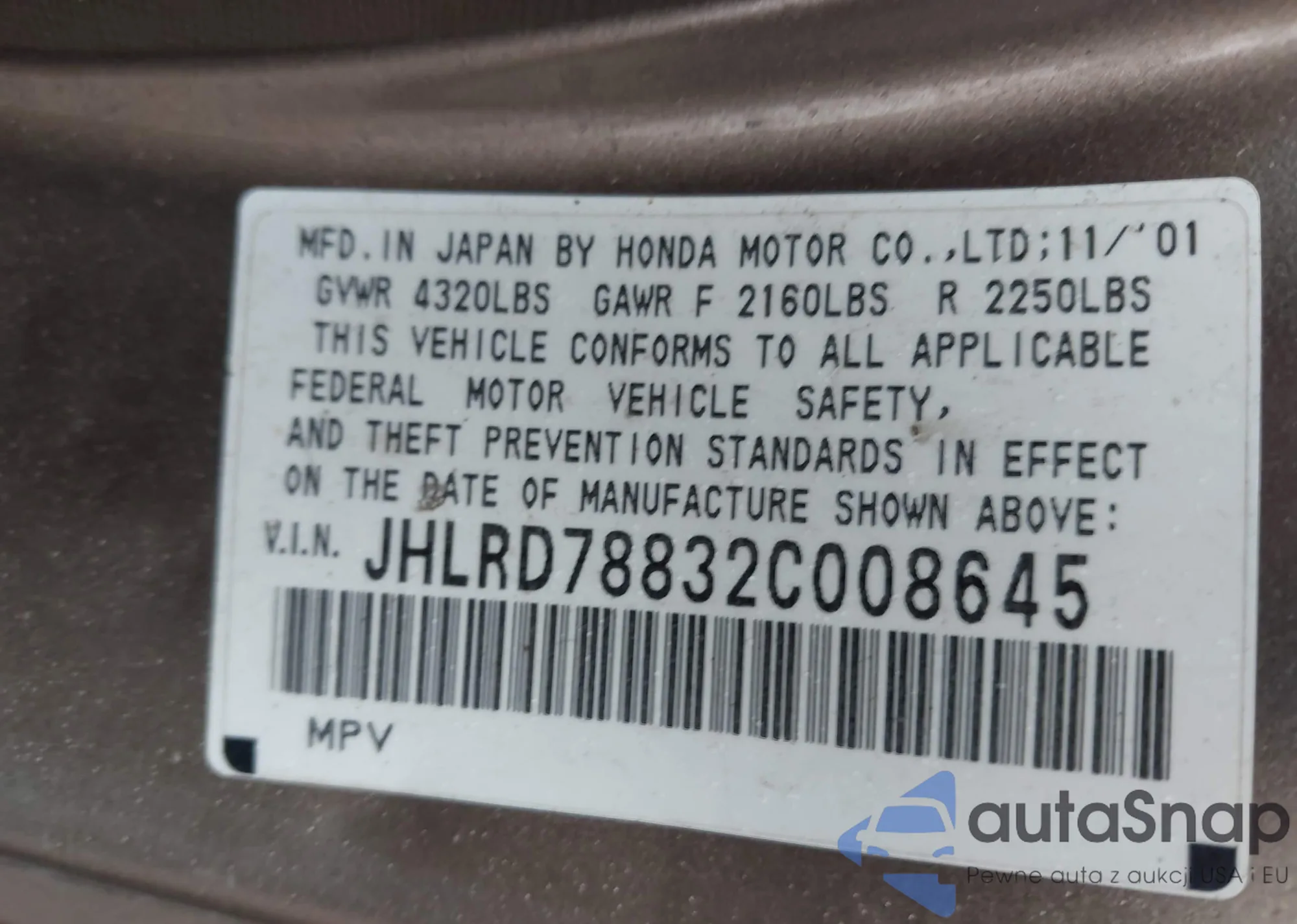 LOT: 43284887 VIN: JHLRD78832C008645