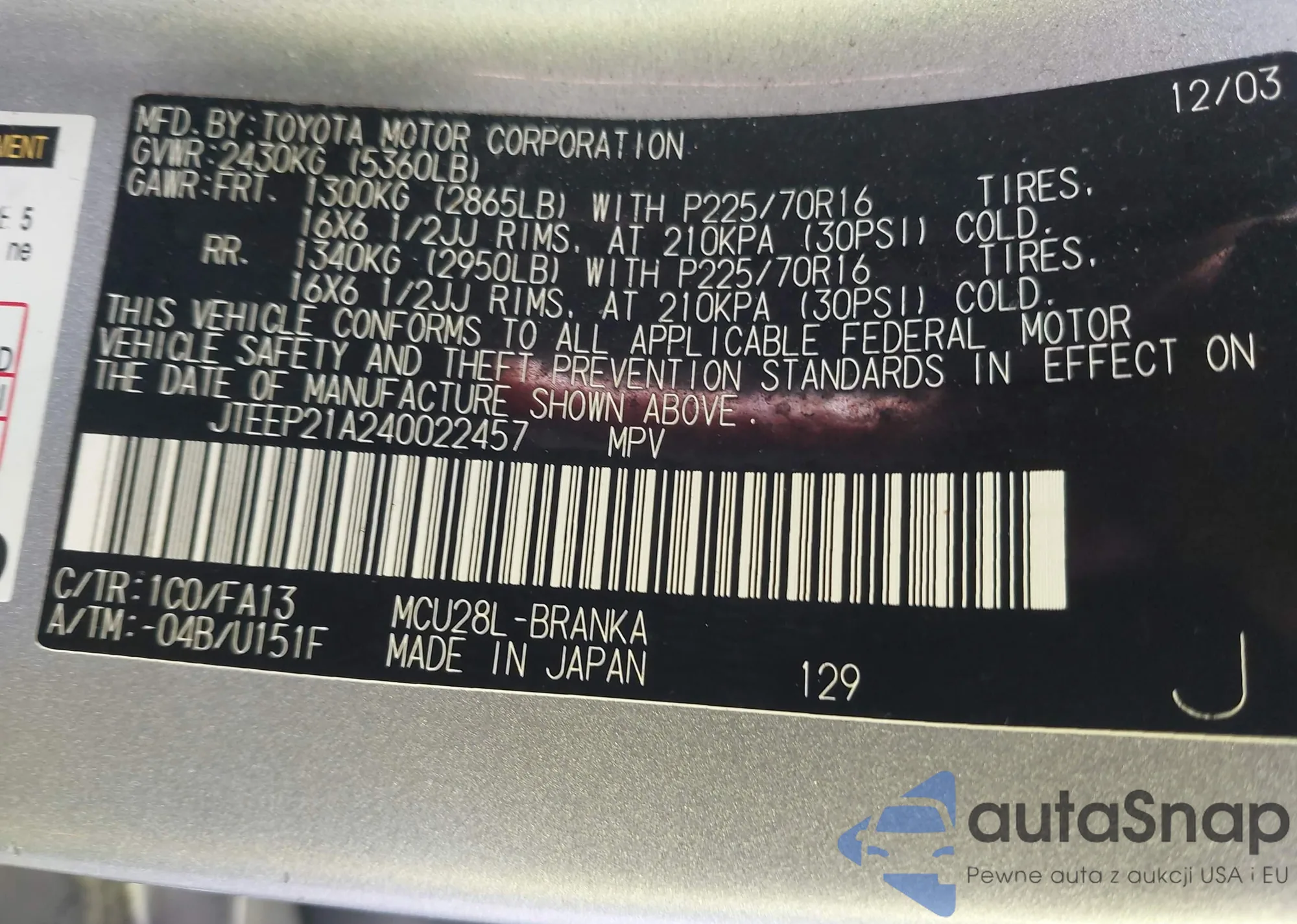 LOT: 43325568 VIN: JTEEP21A240022457