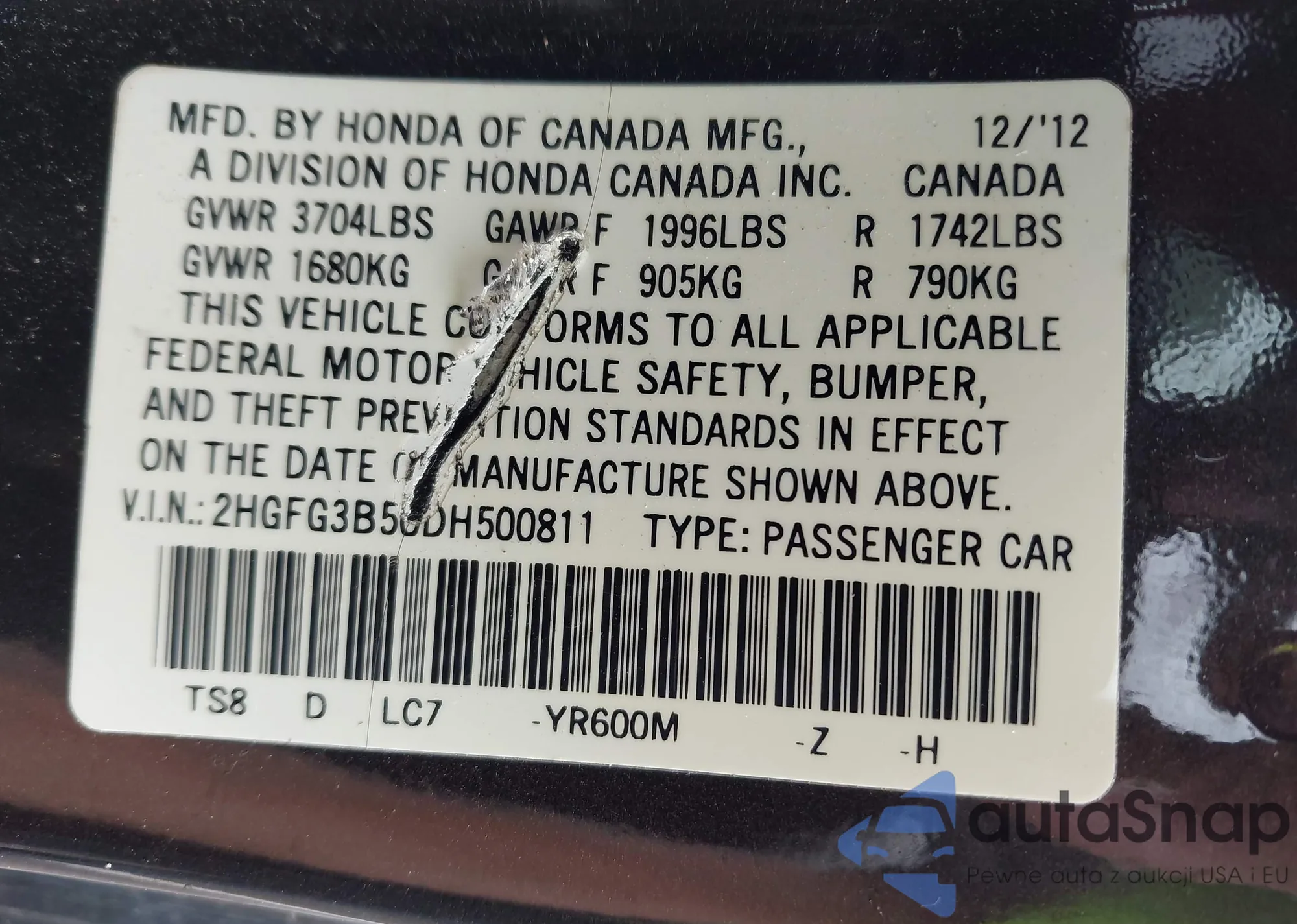 LOT: 43187207 VIN: 2HGFG3B50DH500811