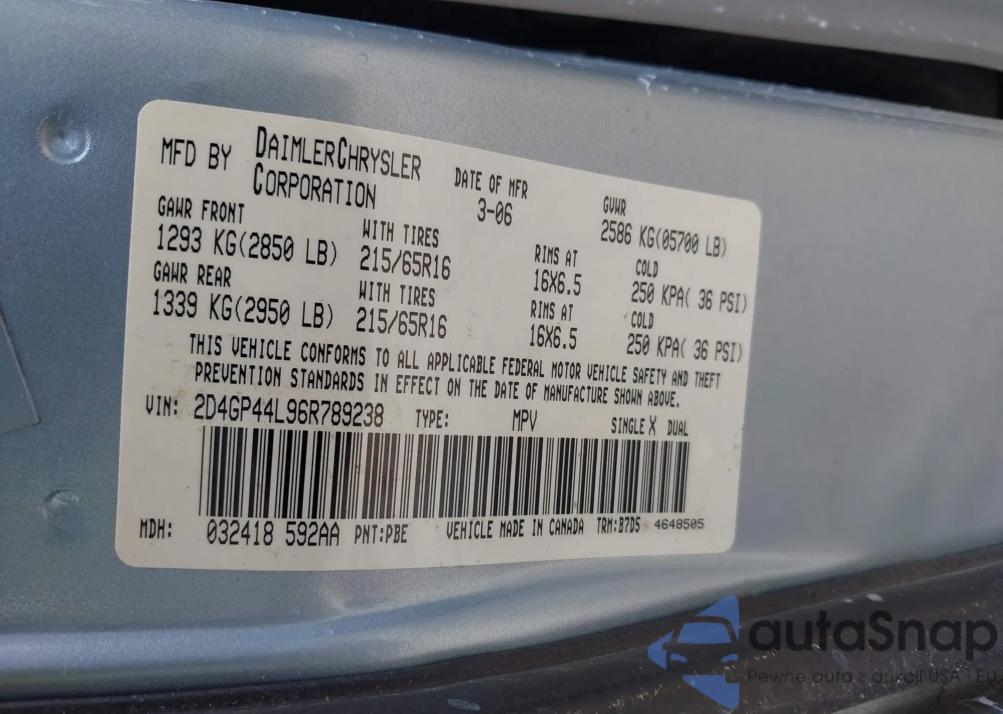 LOT: 42869206 VIN: 2D4GP44L96R789238