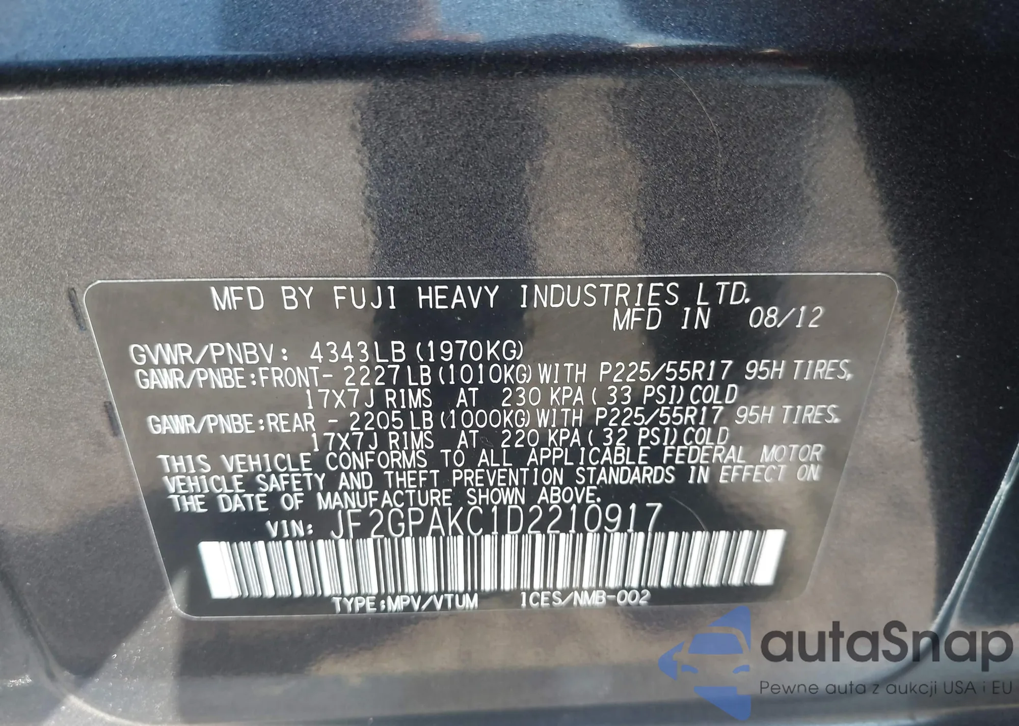 LOT: 43247751 VIN: JF2GPAKC1D2210917