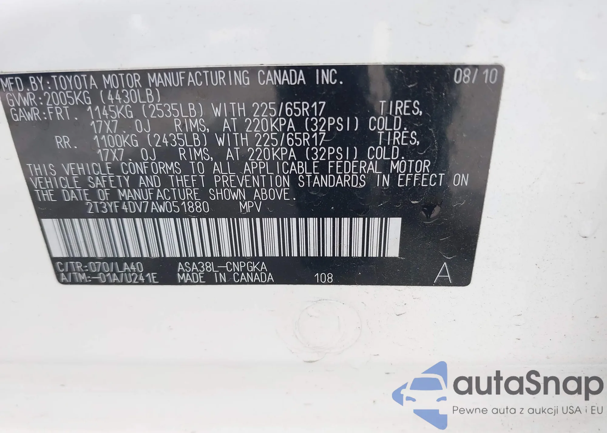 • VIN 2T3YF4DV7AW051880