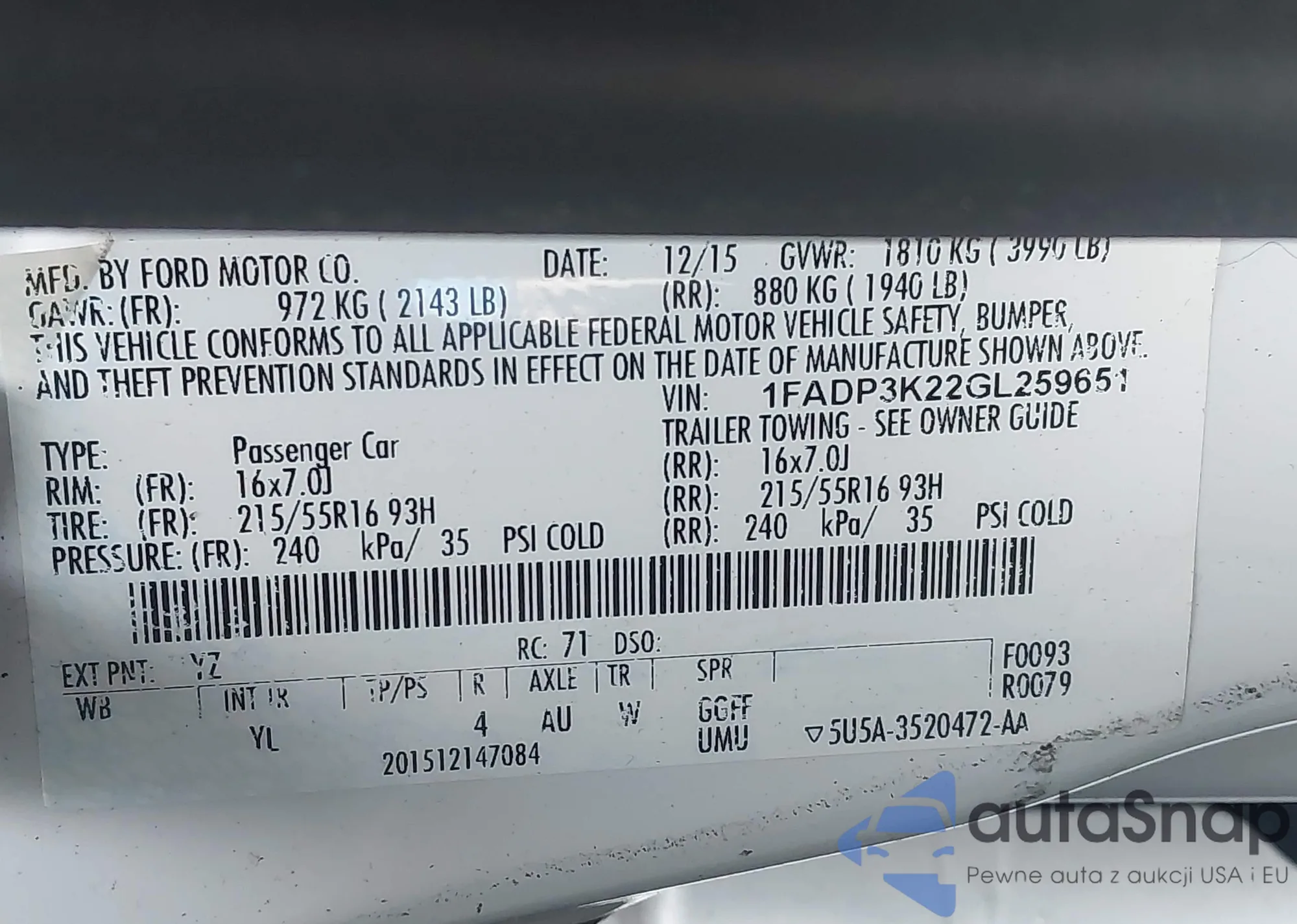 LOT: 43202466 VIN: 1FADP3K22GL259651