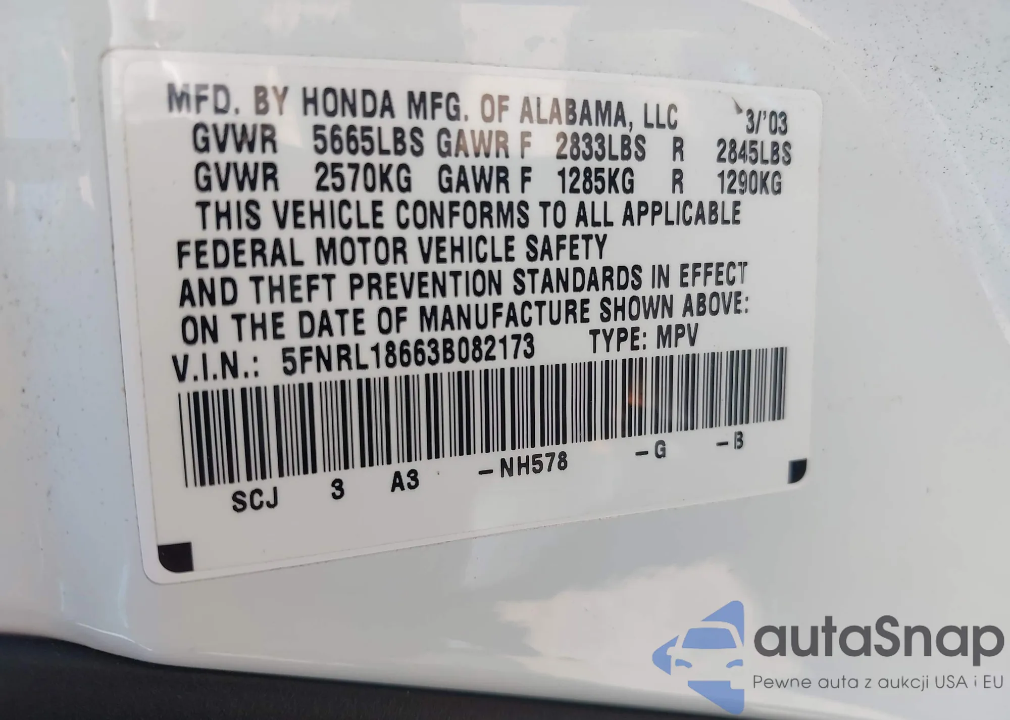 • VIN 5FNRL18663B082173