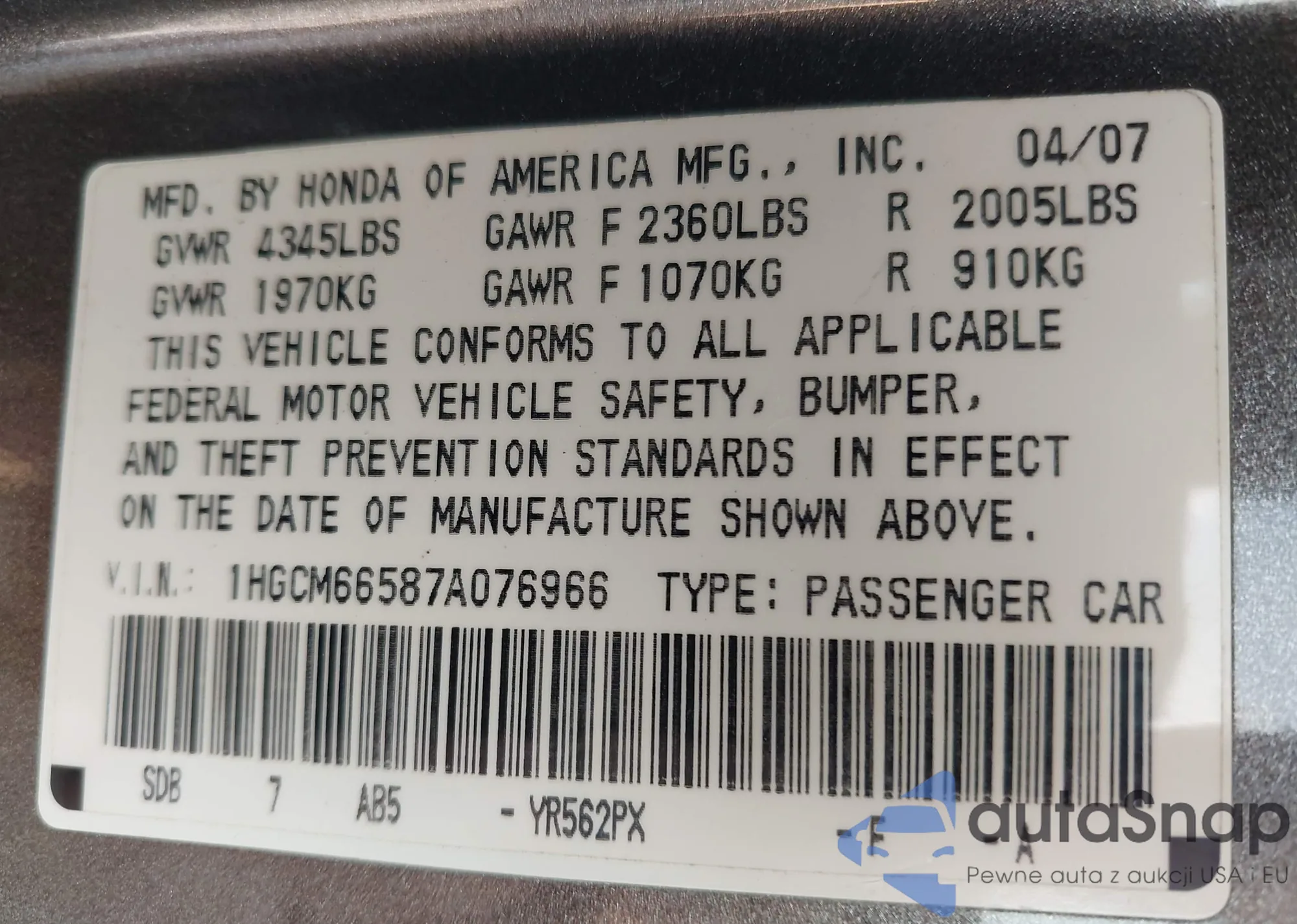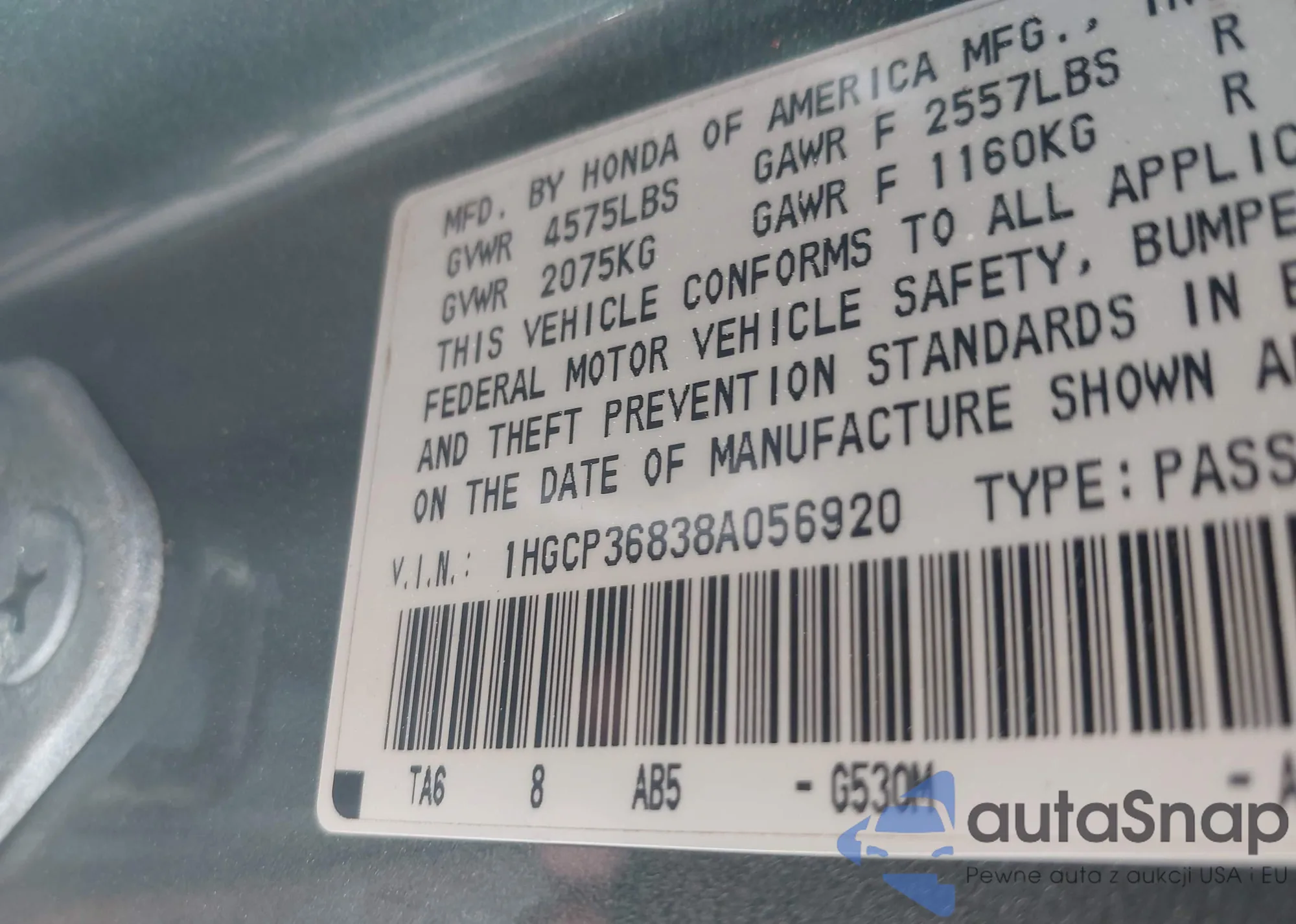LOT: 41898923 VIN: 1HGCP36838A056920