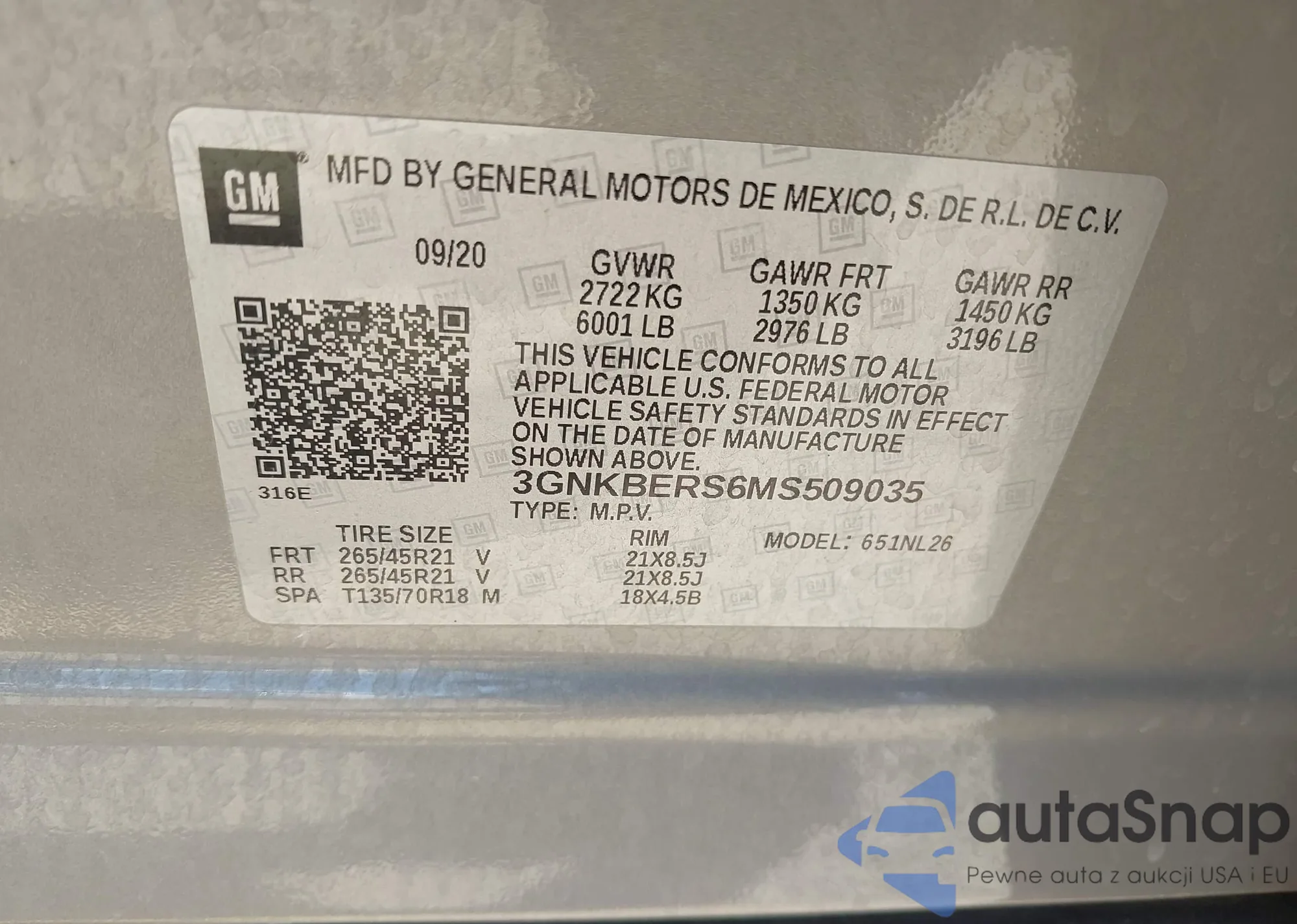 LOT: 43160106 VIN: 3GNKBERS6MS509035