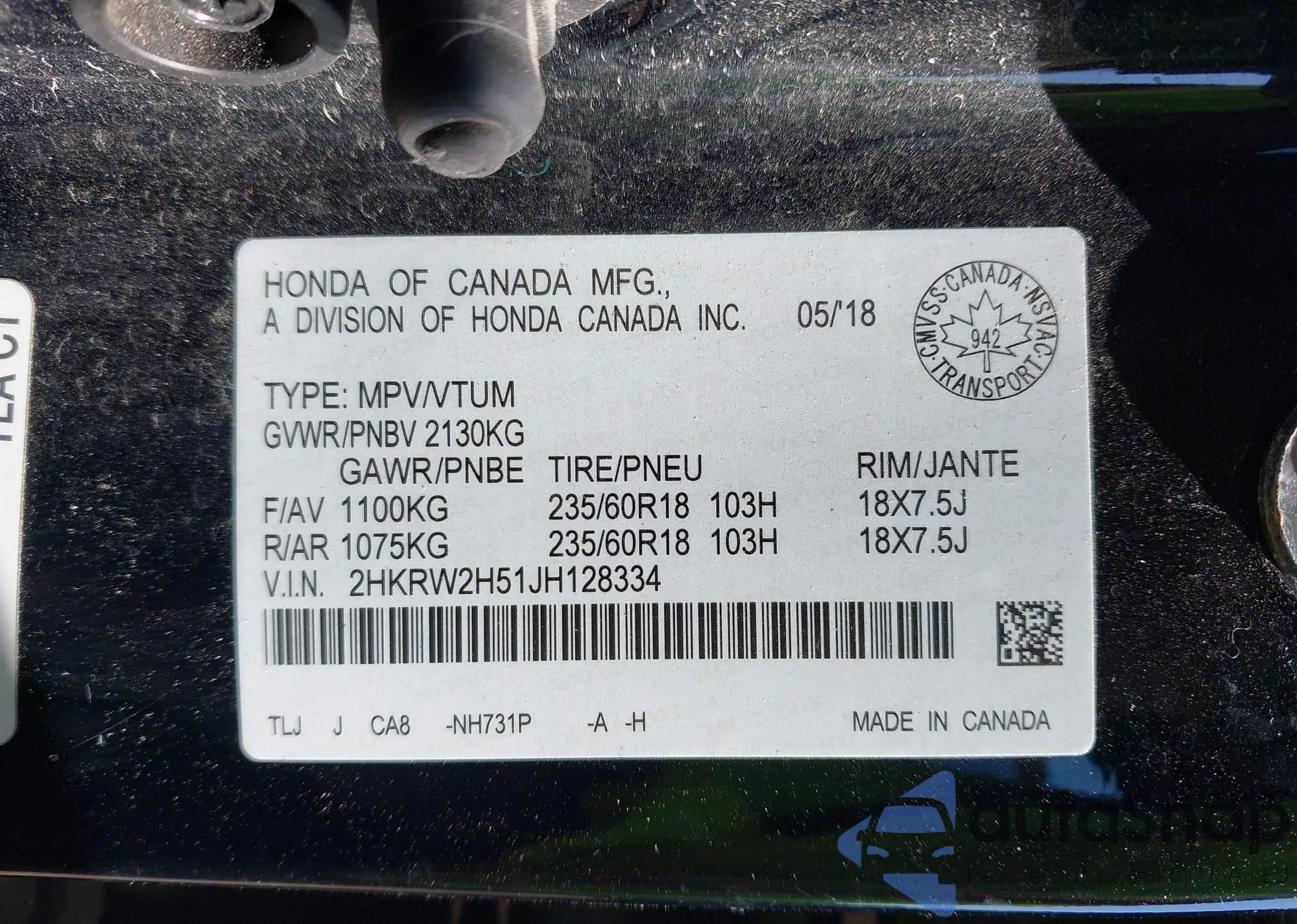 • VIN 2HKRW2H51JH128334