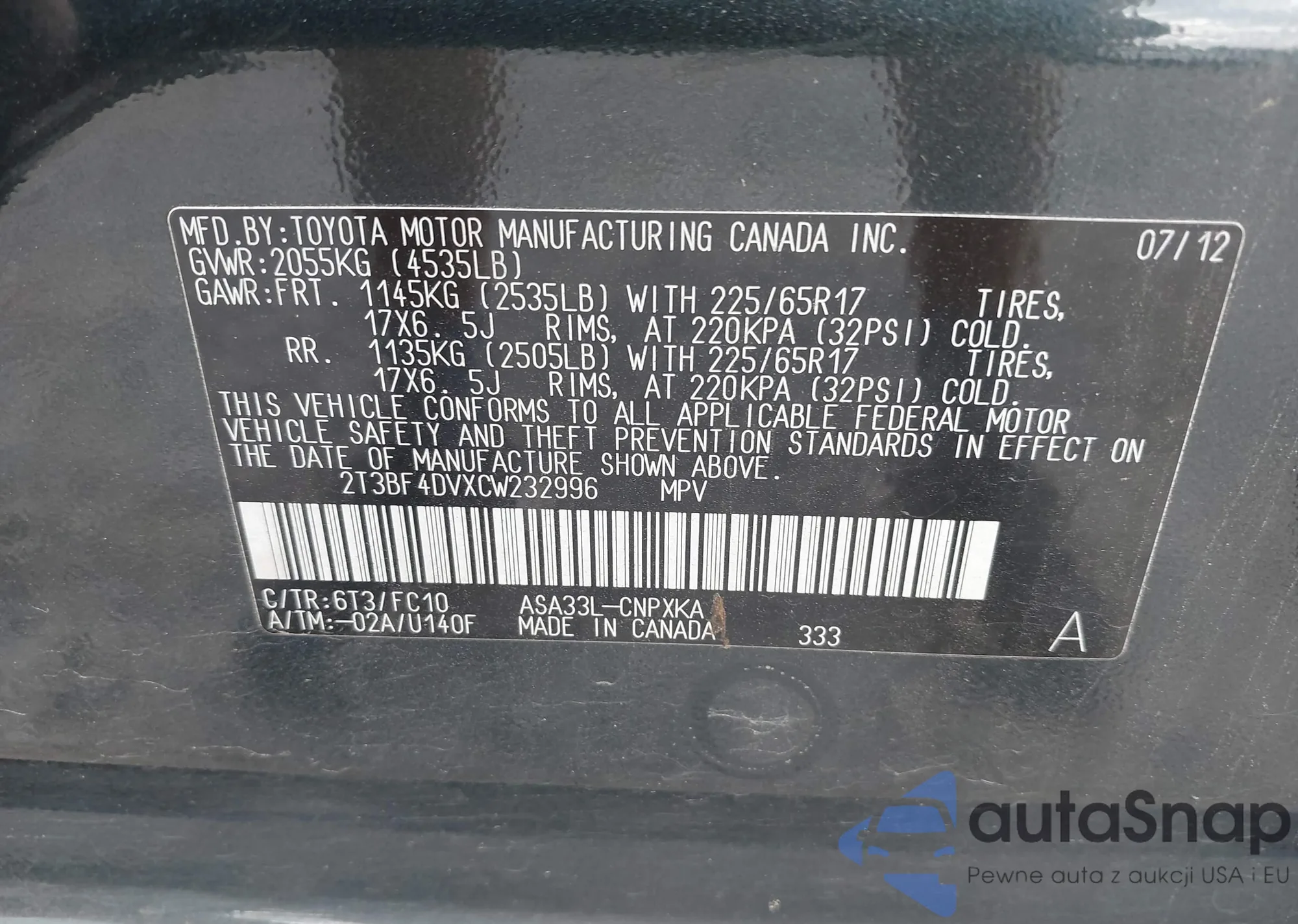 LOT: 43160313 VIN: 2T3BF4DVXCW232996