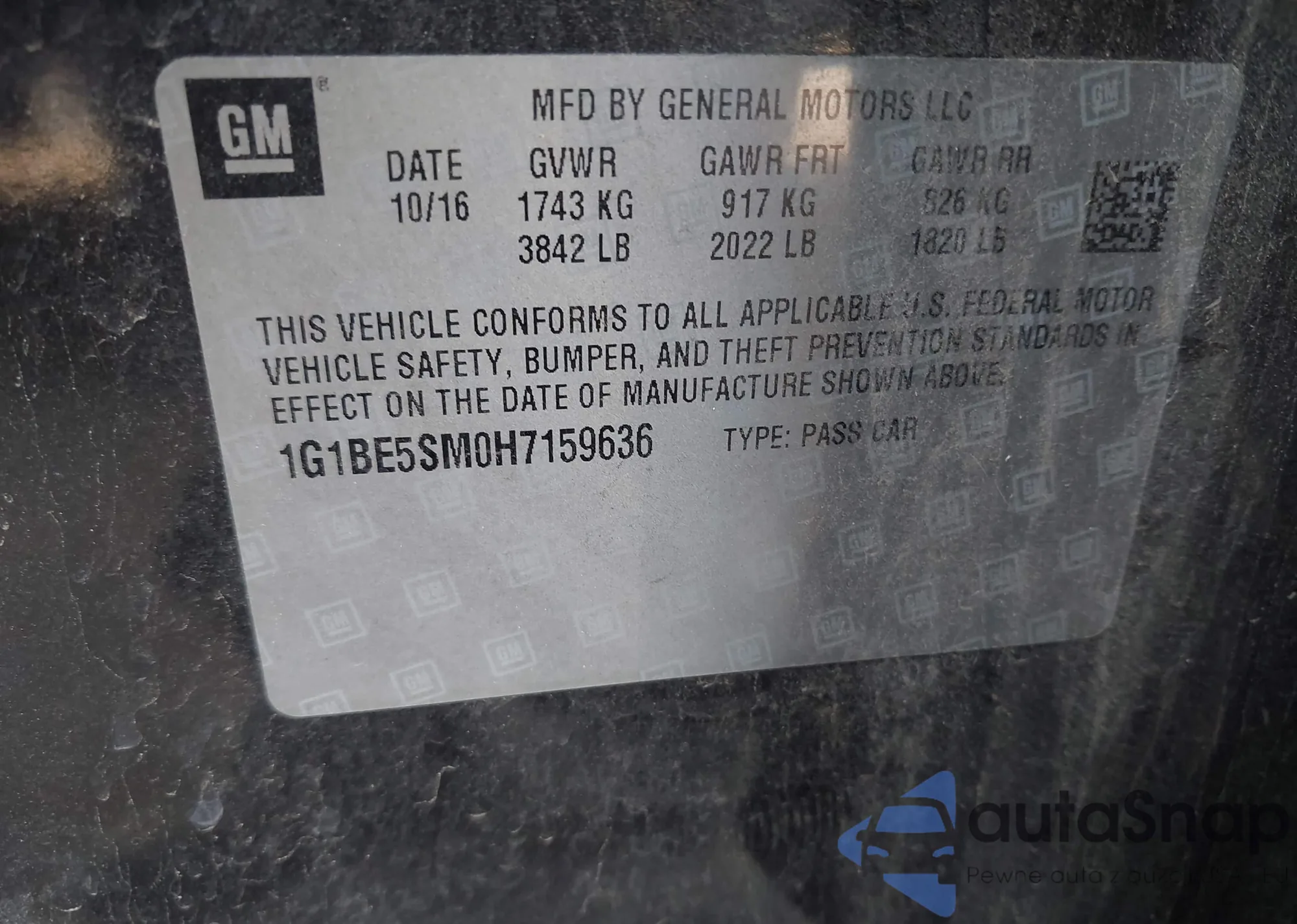 LOT: 43163829 VIN: 1G1BE5SM0H7159636