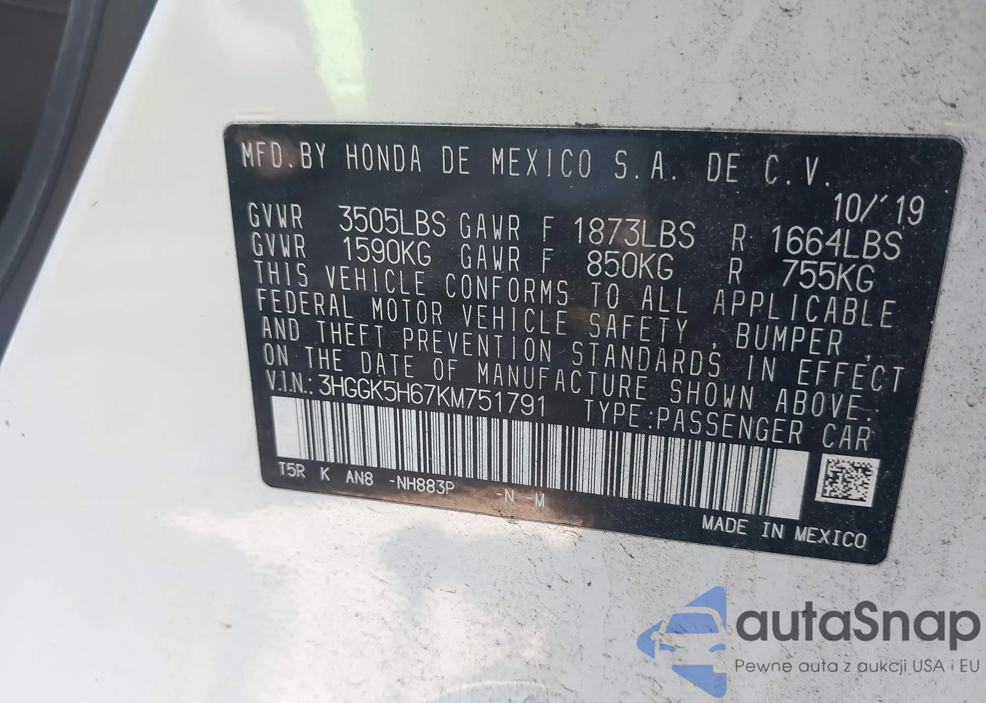 LOT: 42951879 VIN: 3HGGK5H67KM751791